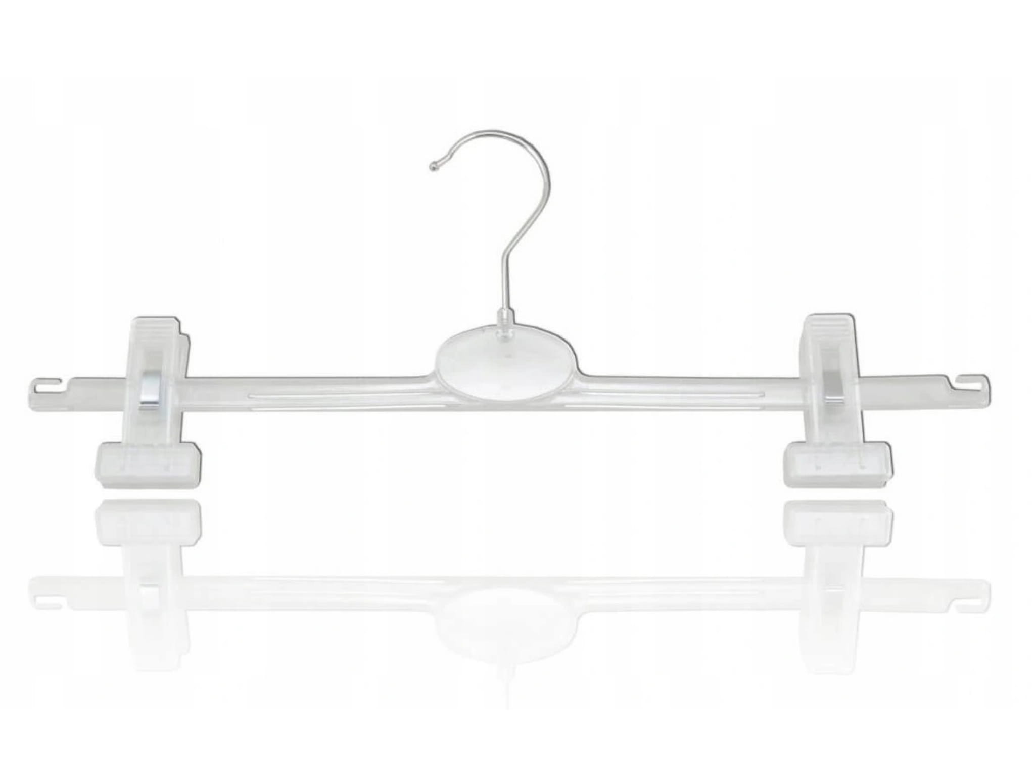 Hanger is designed mostly for skirts display but also for trousers. With clips sliding along arms - adjustment of separation between clips is from 15 cm to 32 cm. Hanger has under the clips the profiled, rubber strips, for which clothes are not damaged and does not fall from hanger. Special cuts at the end of hanger allows additional hang of clothes!