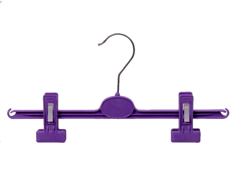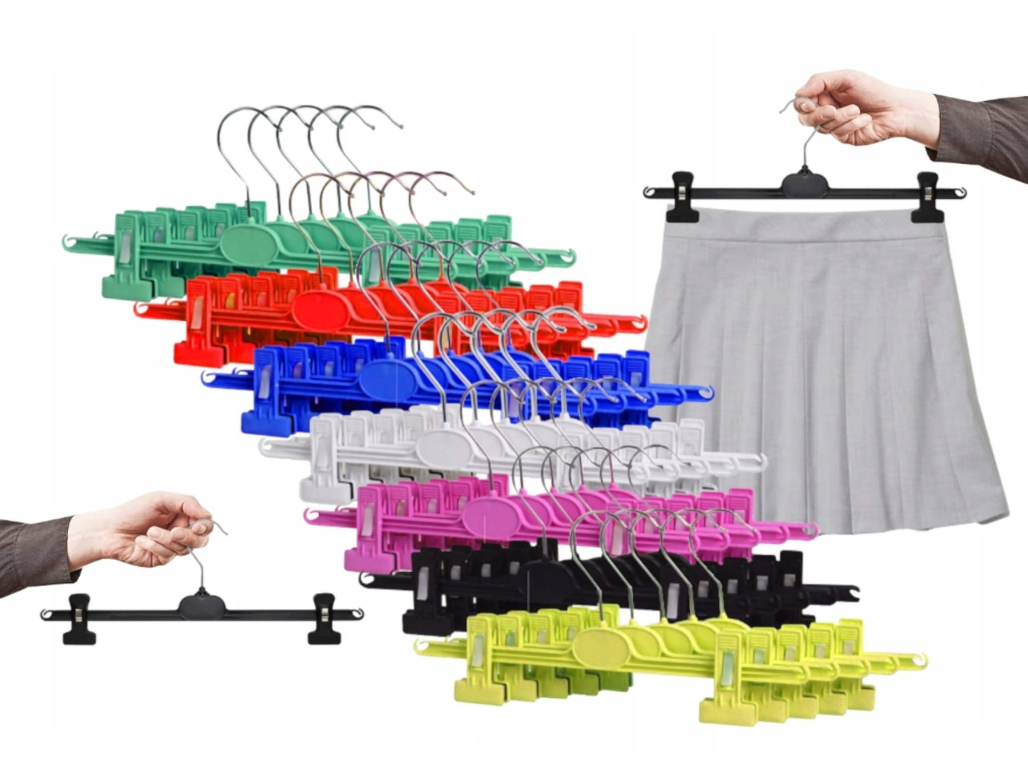 Hanger is designed mostly for skirts display but also for trousers. With clips sliding along arms - adjustment of separation between clips is from 15 cm to 40 cm. Hanger has under the clips the profiled, rubber strips, for which clothes are not damaged and does not fall from hanger. Special cuts at the end of hanger allows additional hang of clothes!