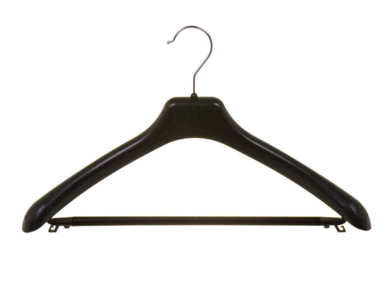 Universal garment hanger with bar is made of durable plastic, revolving. Hanger is designed for display shirts, cardigans, jackets, trousers, etc. Delicate grooves on the shoulders of the hanger protect from slipping clothing. Ideal for presentation and storage of clothing.