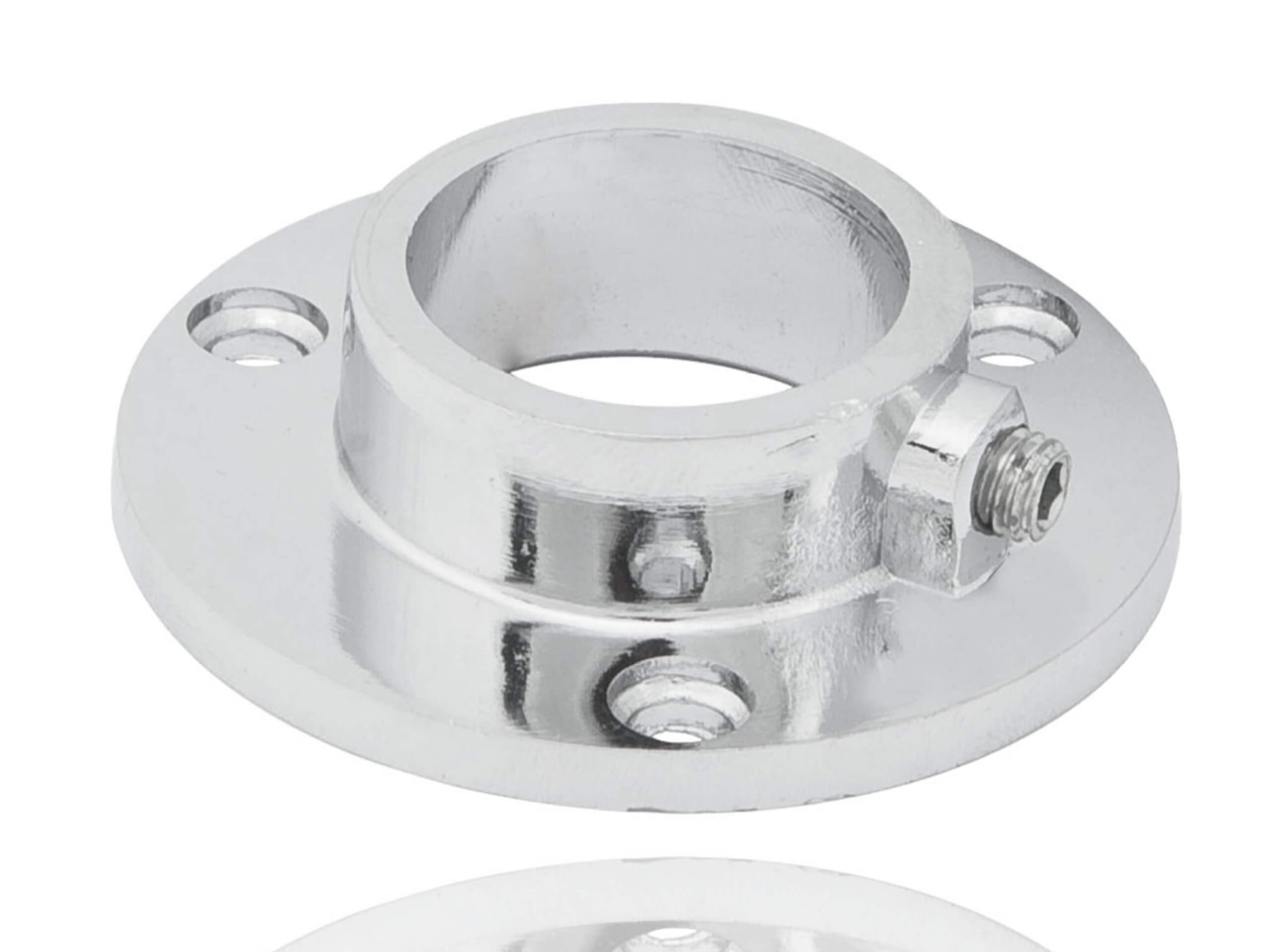 This chrome-plated hinged joint is designed for tube with diameter of 25 mm/32 mm/50 mm. It is used as a ending mounted to wall.