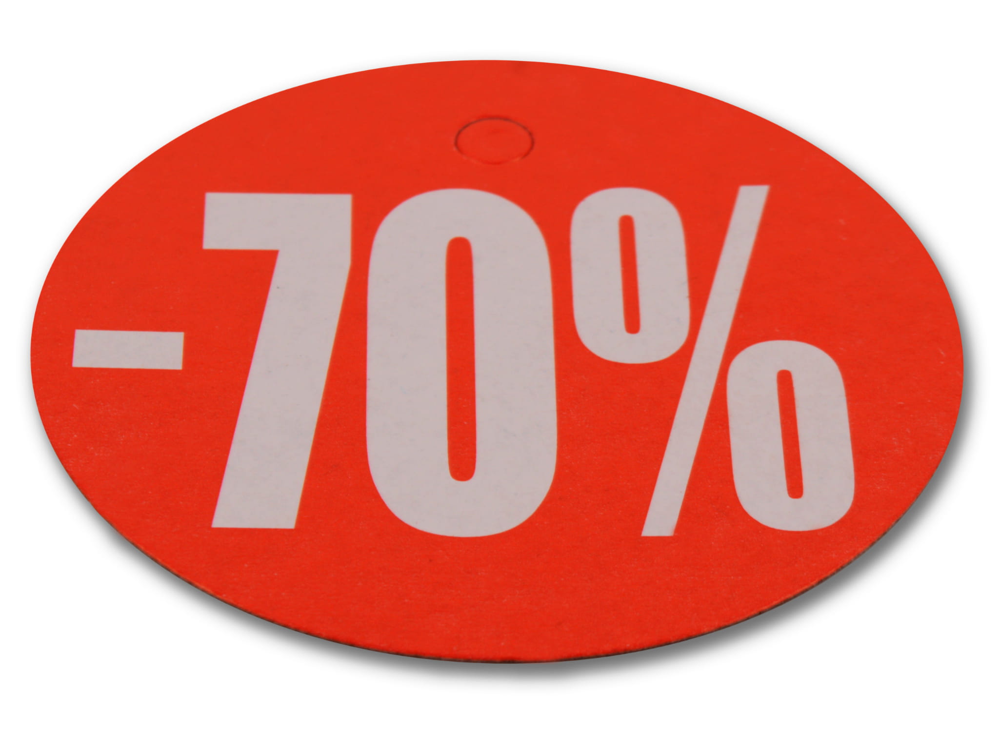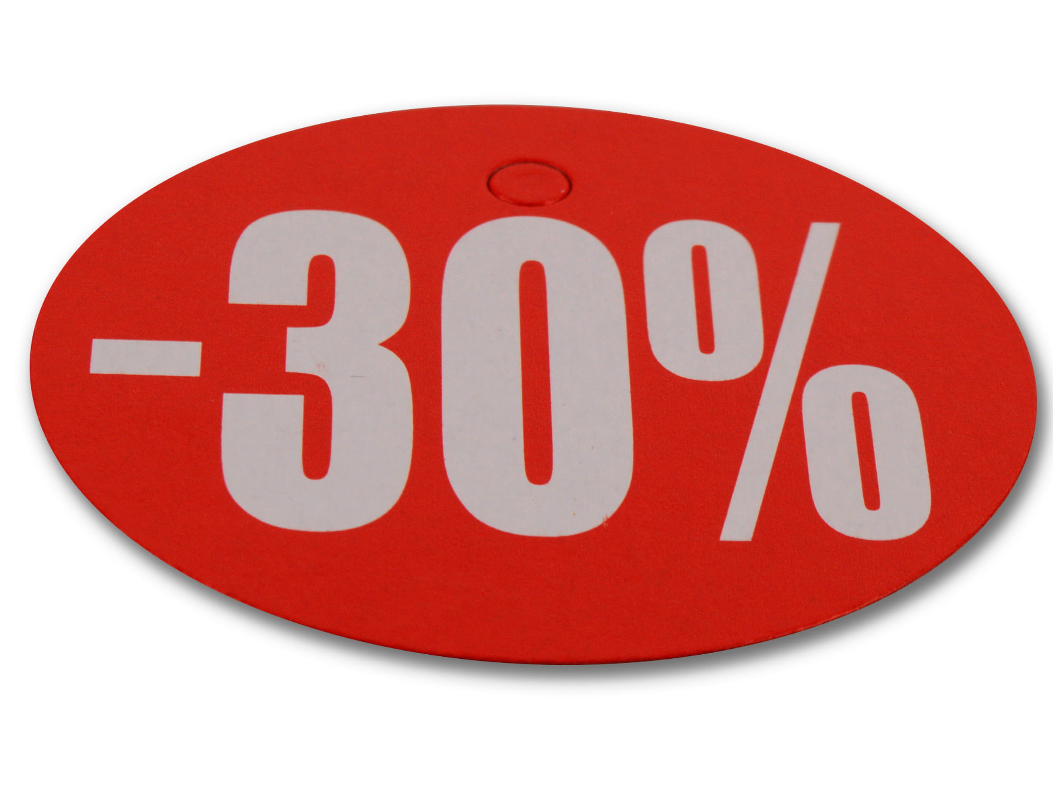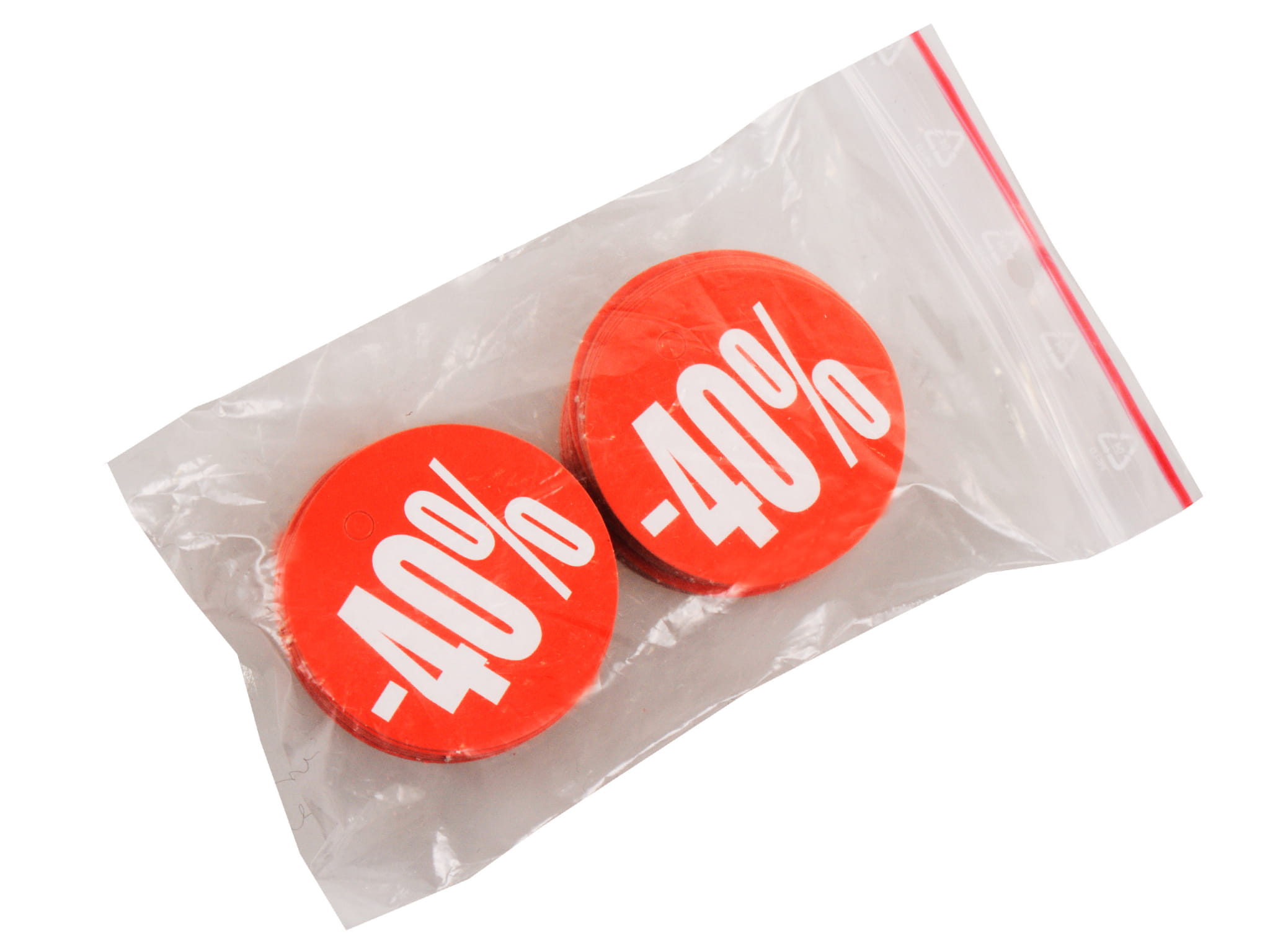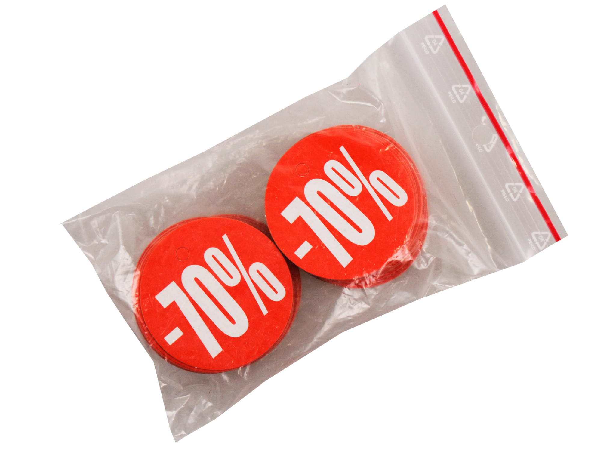 Cardboard circle with a large inscription defining the level of reduction or clean the print. Intended to indicate the promotional goods, made of slick paper in red. The label has an opening at the top to hang the example. Goods denoted above. Labels are bilateral, they have the possibility of writing and washing the subtitle marker suchościeralnym