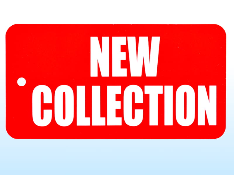 Labels carton with a large sign reading "NEW COLLECTION". Designed for marking goods made of slick paper in red. The labels have a hole at the top for hanging on e.g. denoted goods. Labels are double-sided.