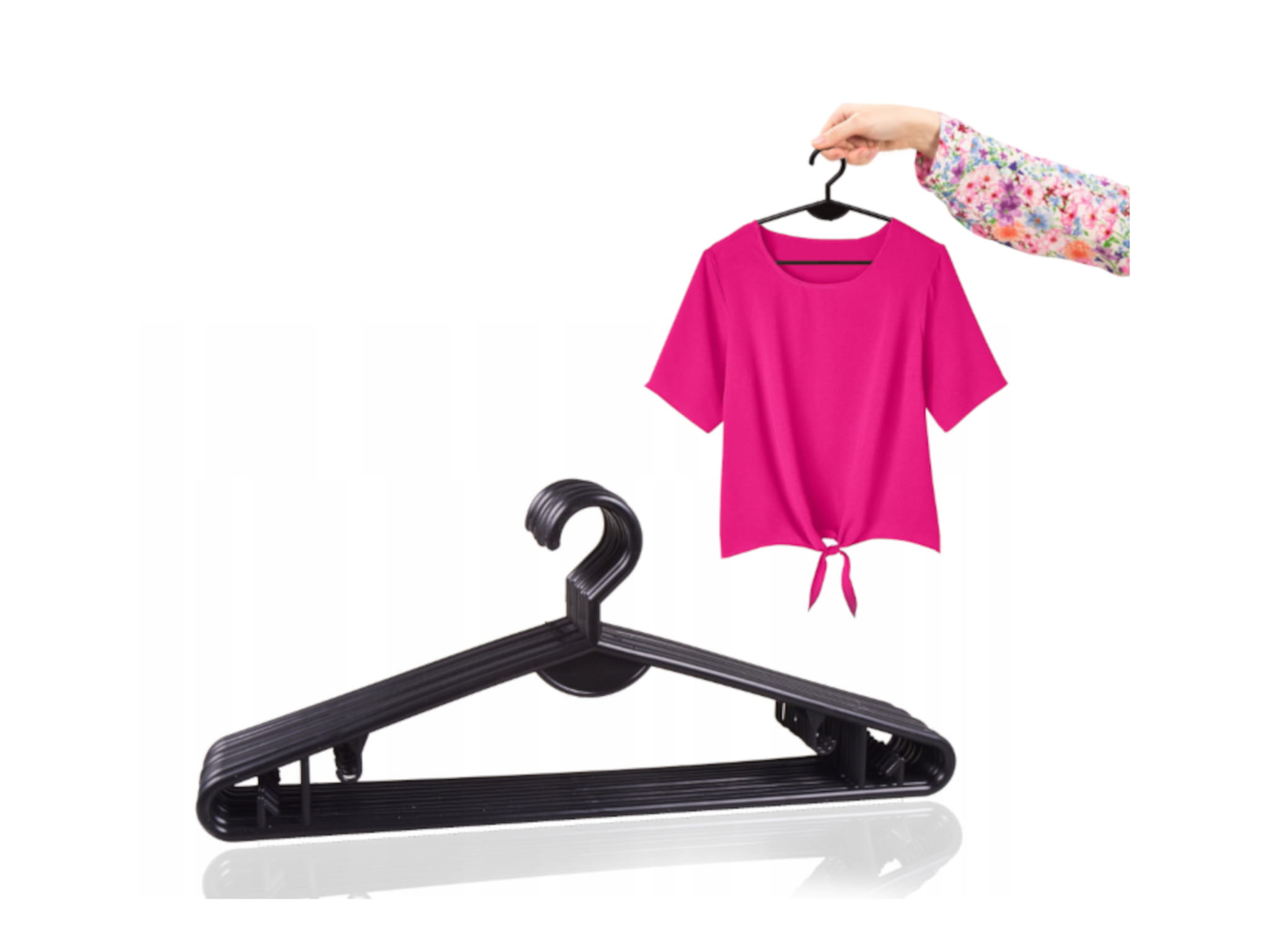 Universal garment hanger with bar is made of durable plastic, non-rotating. Hanger is designed for display shirts, cardigans, jackets, trousers, etc. Perfect for display and store clothes.