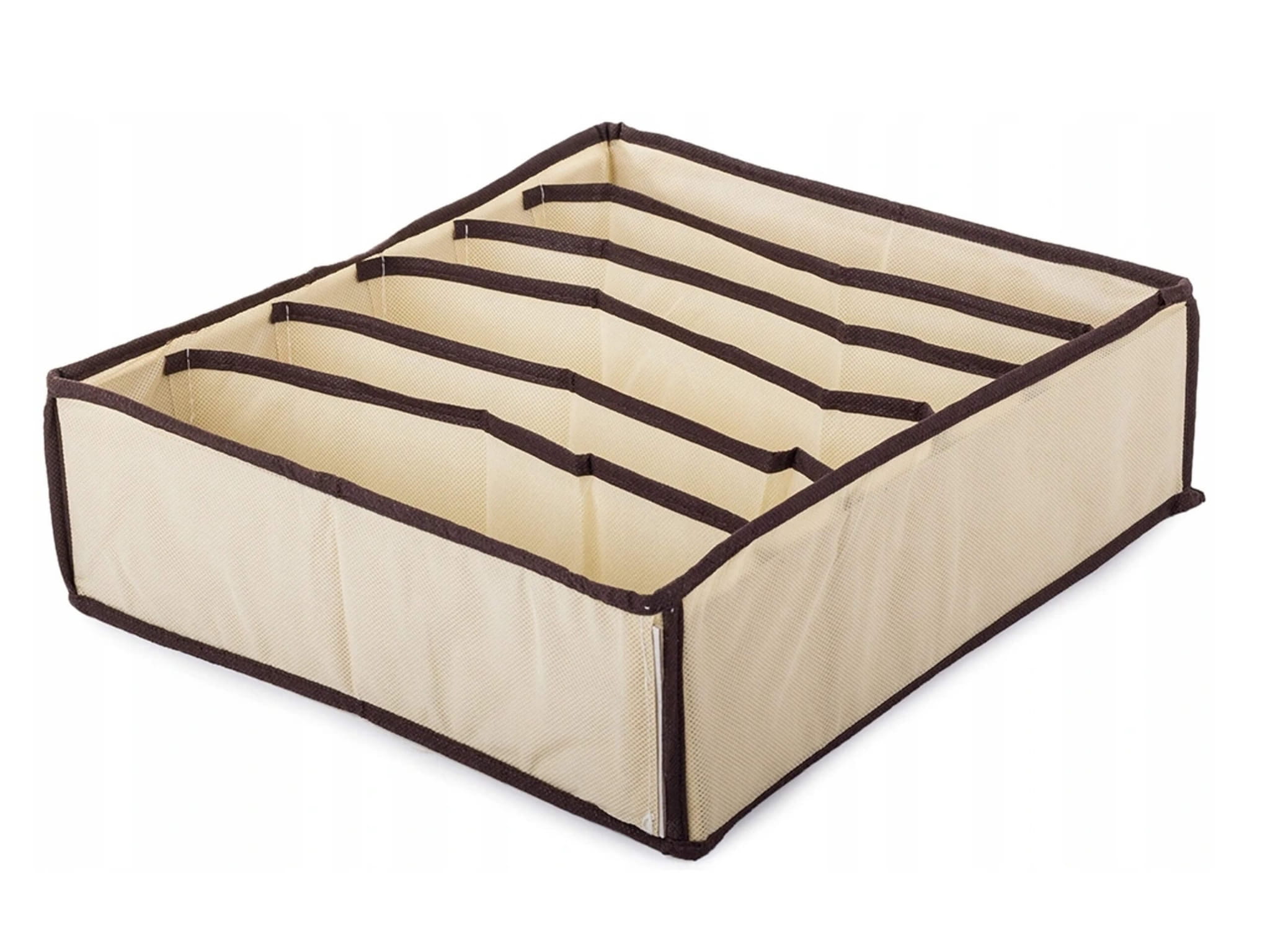 Shelf organiser with 12 partition. With this product, in easy way You can have order in every wardrobe or shelf. It is made of high quality breathable material and it is simple in cleaning. Sides are reinforced by cardboard, which make it more durable. This product hasn't upper cover, which enable us to have easier access to our items.