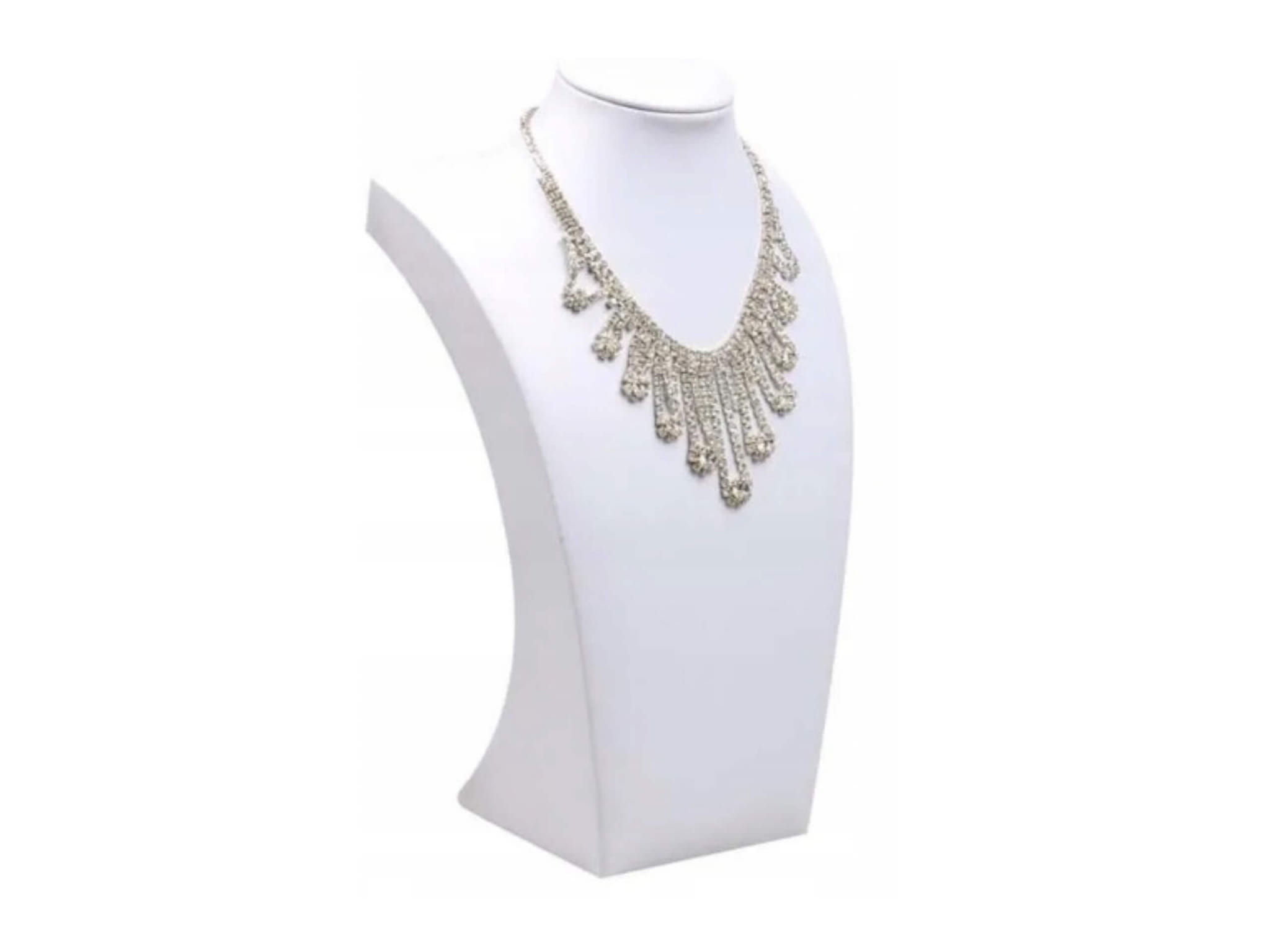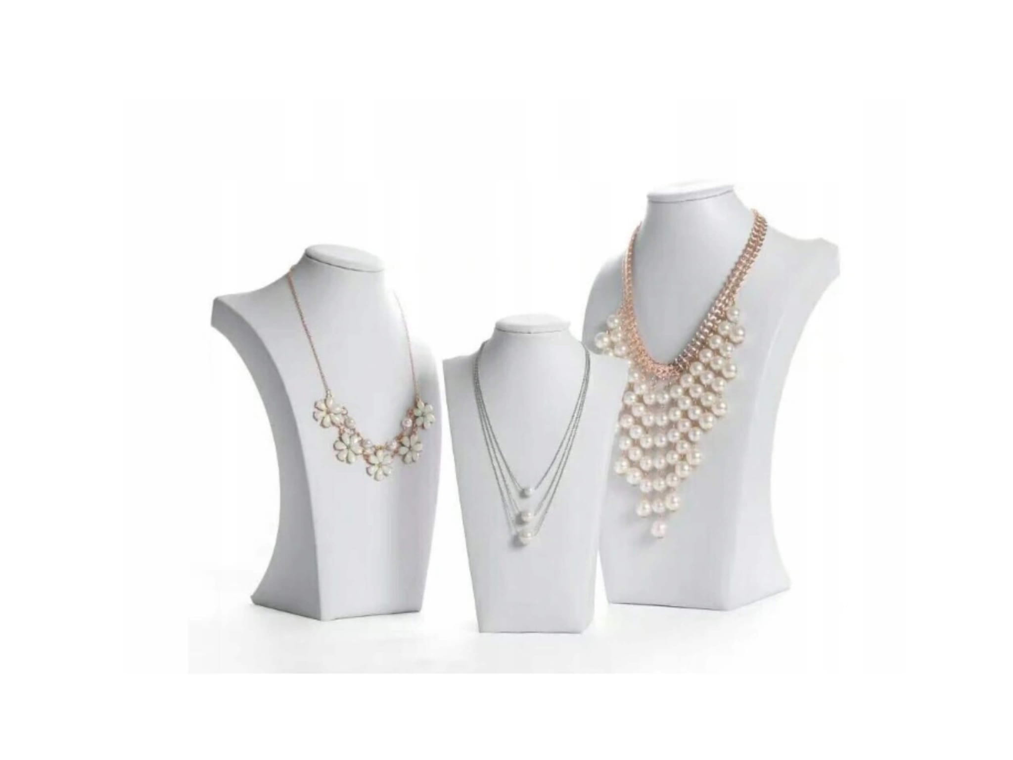 Ekskluzywny ekspozytor w formie popiersia, pokryty elegancką białą ekoskórą. Idealny do prezentacji naszyjników, kolii i łańcuszków zarówno w sklepach jubilerskich, jak i w domowej kolekcji biżuterii.