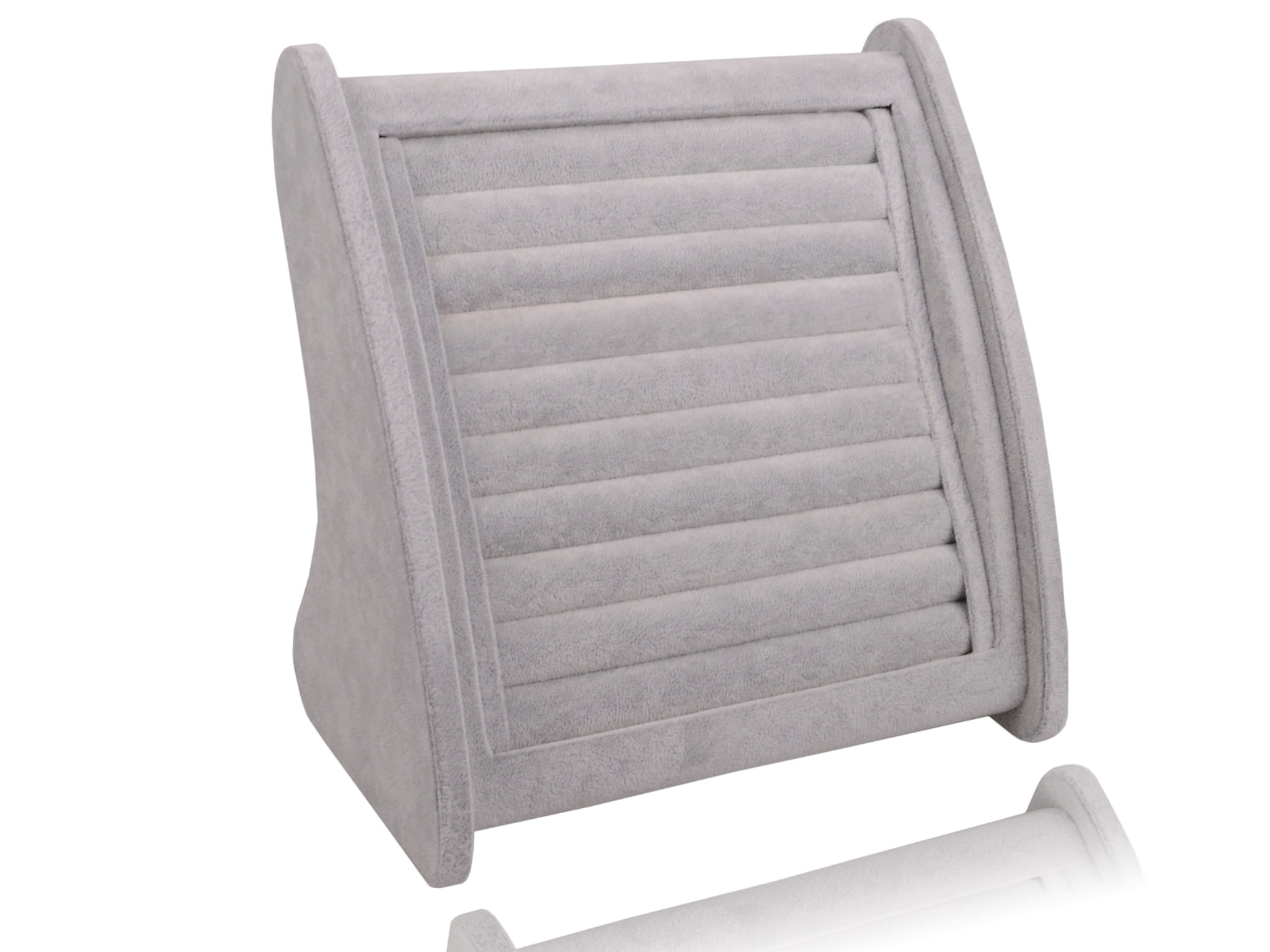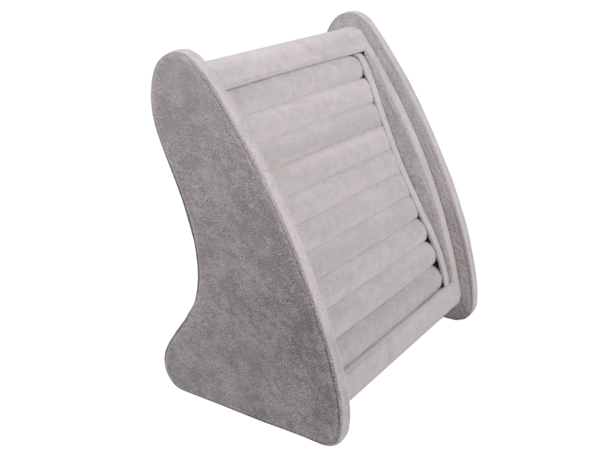 Elegancki ekspozytor z podwójnym wałkiem na prostokątnej podstawie, wykończony miękkim zamszem w modnym odcieniu szarości. Dzięki swojej formie i kolorystyce świetnie podkreśla piękno biżuterii, przyciągając uwagę klientów....