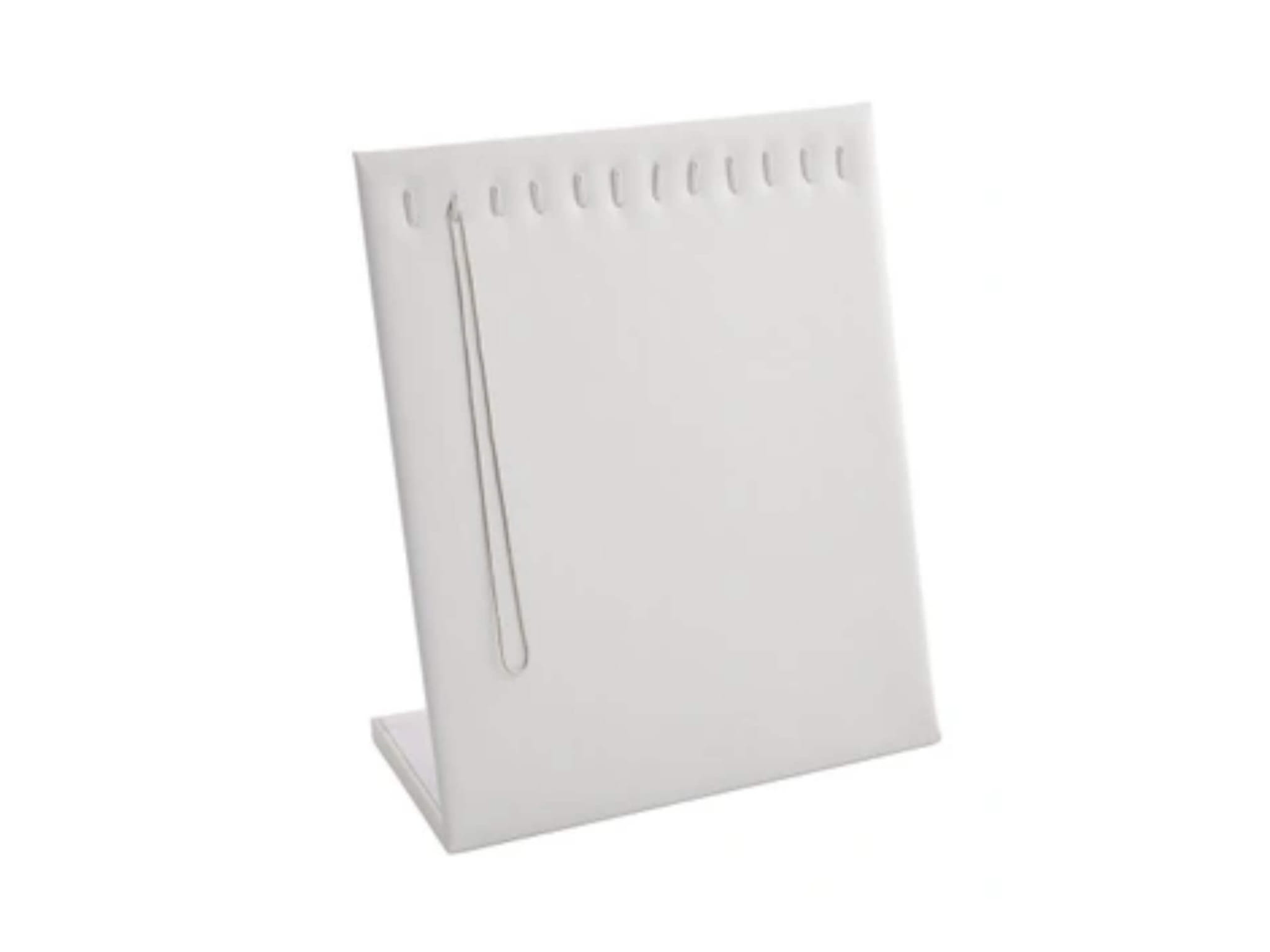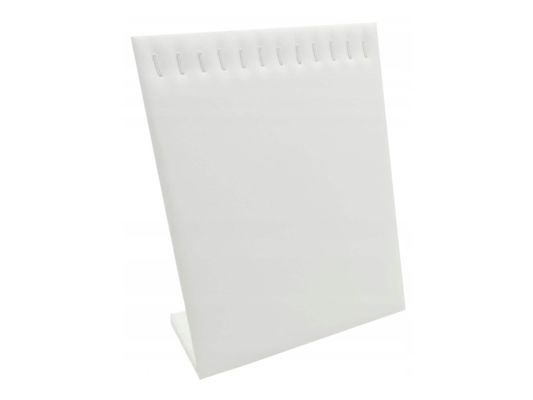 Elegancki stojak na biżuterię wykonany z białej ekoskóry, wyposażony w 12 zaczepów. Idealny do prezentacji łańcuszków i zawieszek zarówno w sklepie, jak i w domu.