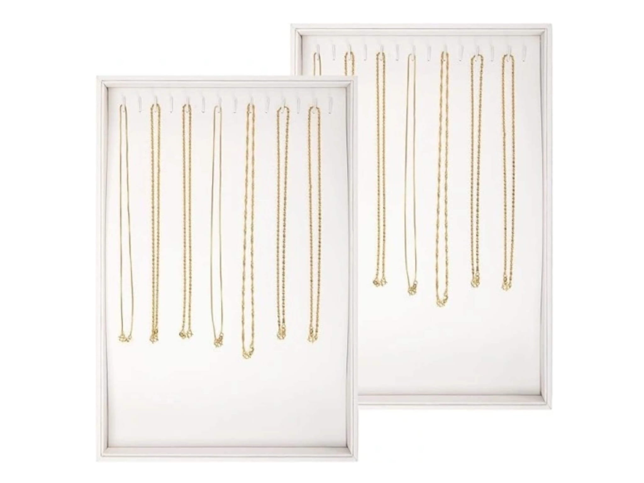 Elegancka tacka ekspozycyjna na łańcuszki i kolczyki – biały stojak z 14 zaczepami