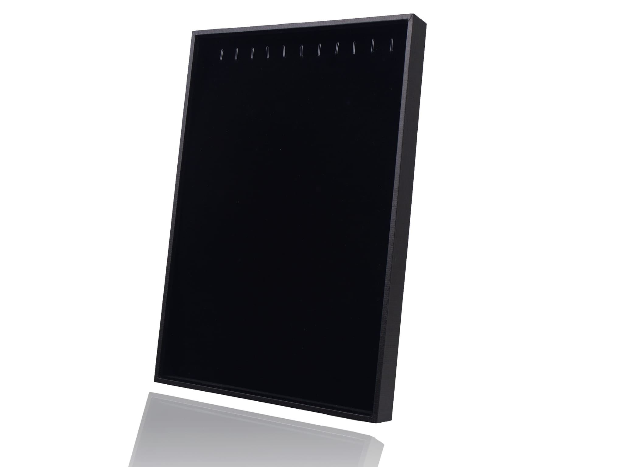 Tacka do eksponowania biżuterii- łańcuszków, wisiorków, zawieszek. Pokryta tworzywem sztucznym o strukturze zamszu, w kolorze czarnym. Pozwala na eleganckie i efektowne prezentowanie wyrobów jubilerskich. Tacka posiada wybrzuszenie dzięki, któremu to...