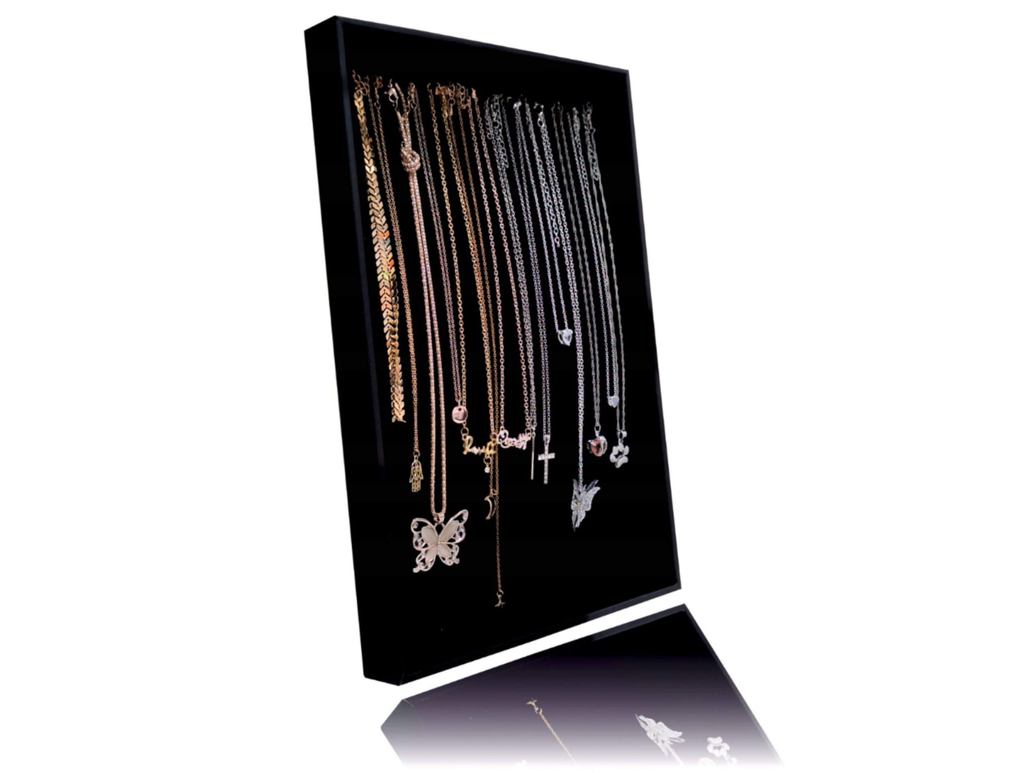 Elegancka tacka ekspozycyjna przeznaczona do prezentacji łańcuszków, zawieszek, breloczków i innych drobiazgów. Stylowe i praktyczne rozwiązanie do uporządkowania biżuterii zarówno w domu, jak i w sklepie...