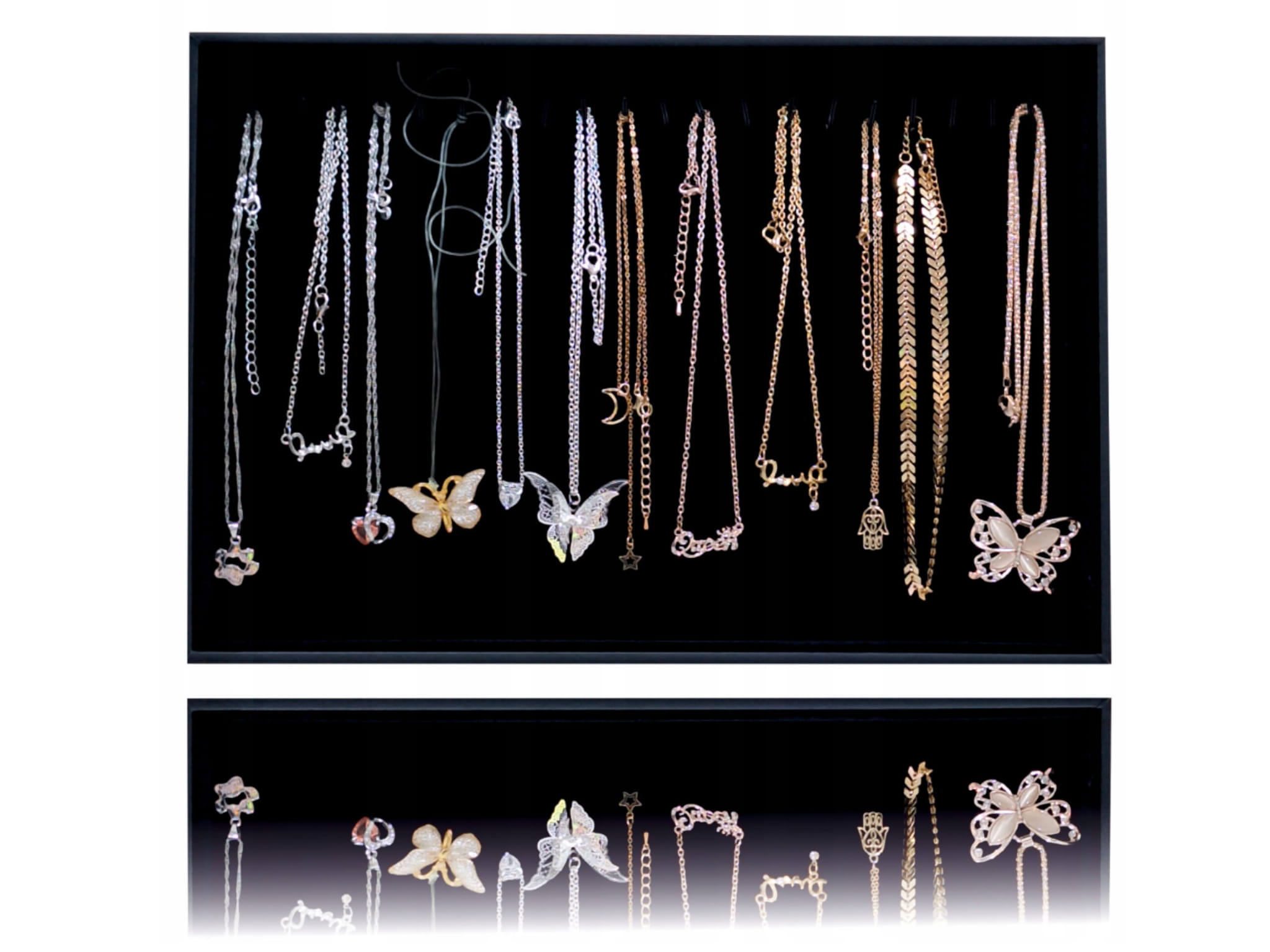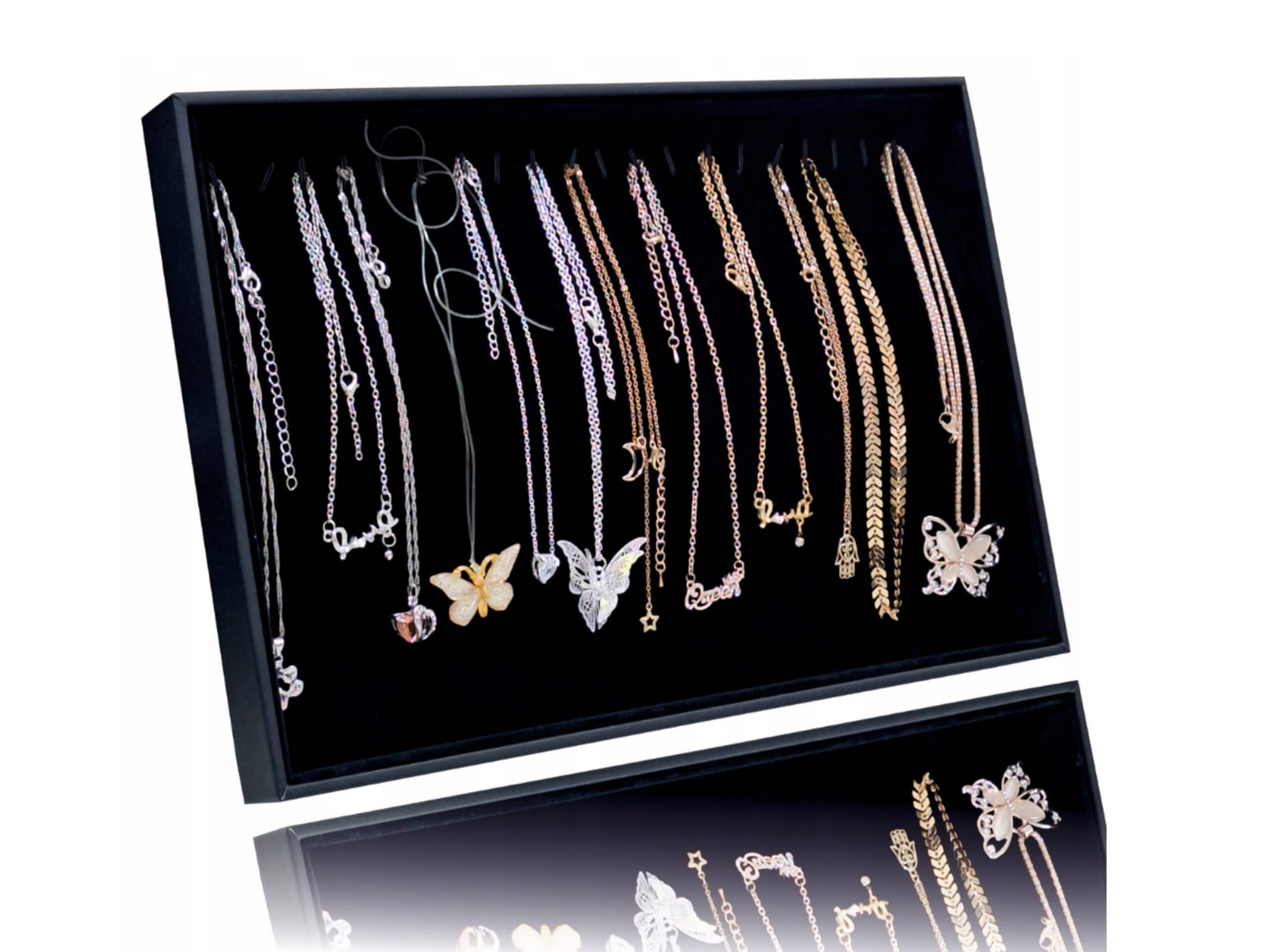 Elegancka tacka do prezentacji łańcuszków, zawieszek, breloczków i innych drobiazgów. Doskonała zarówno do użytku domowego, jak i profesjonalnego – w butikach, na stoiskach czy w salonach jubilerskich.