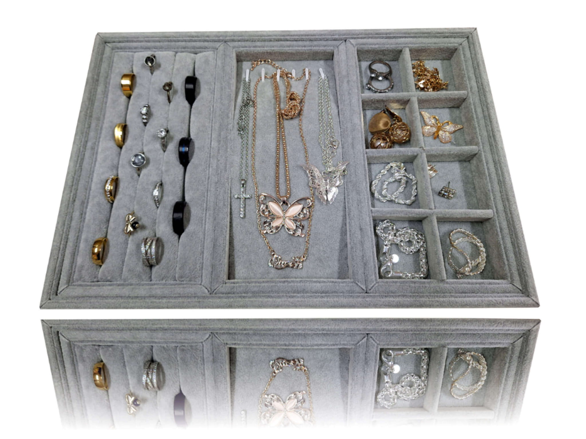 Ekspozytor tacka na biżuterię z przegrodami do segregowania szary welur