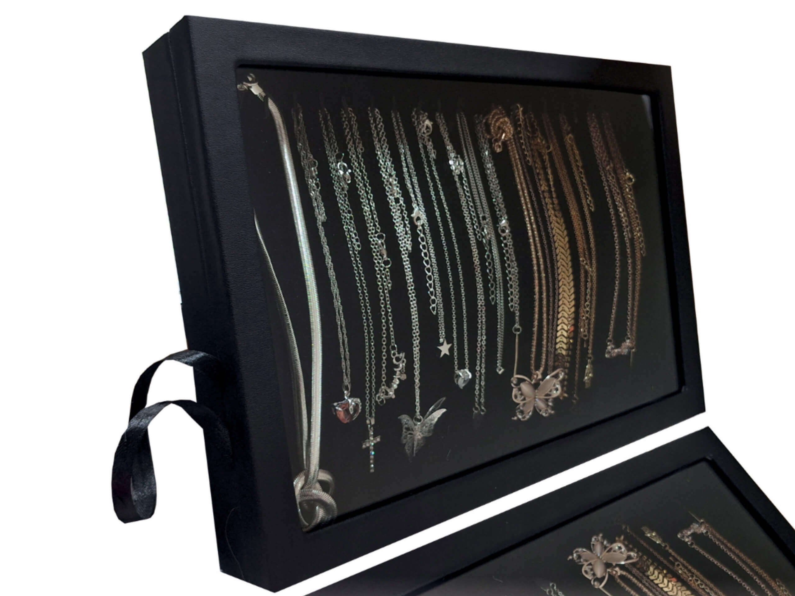 Elegancka tacka do eksponowania łańcuszków, zawieszek, breloczków i innych drobiazgów. Dzięki przeszklonej, zamykanej pokrywie biżuteria jest doskonale widoczna i jednocześnie chroniona przed kurzem i uszkodzeniami. Praktyczne i estetyczne rozwiązanie zarówno do użytku domowego, jak i profesjonalnego.