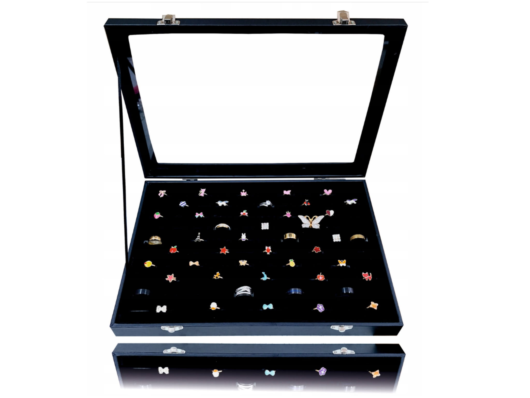 Zamykany ekspozytor na 100 pierścionków – elegancka tacka z pokrywą, kolor czarny