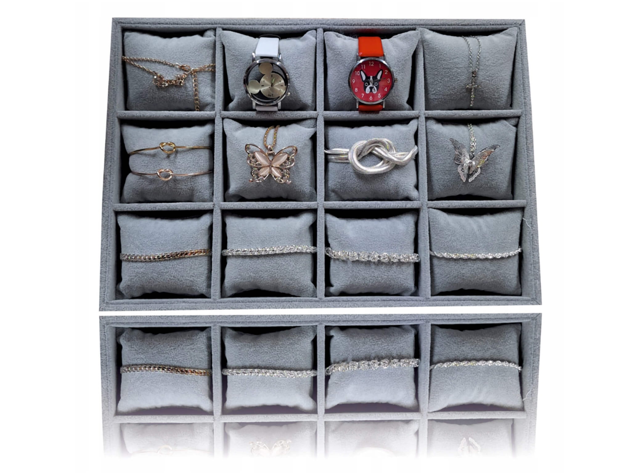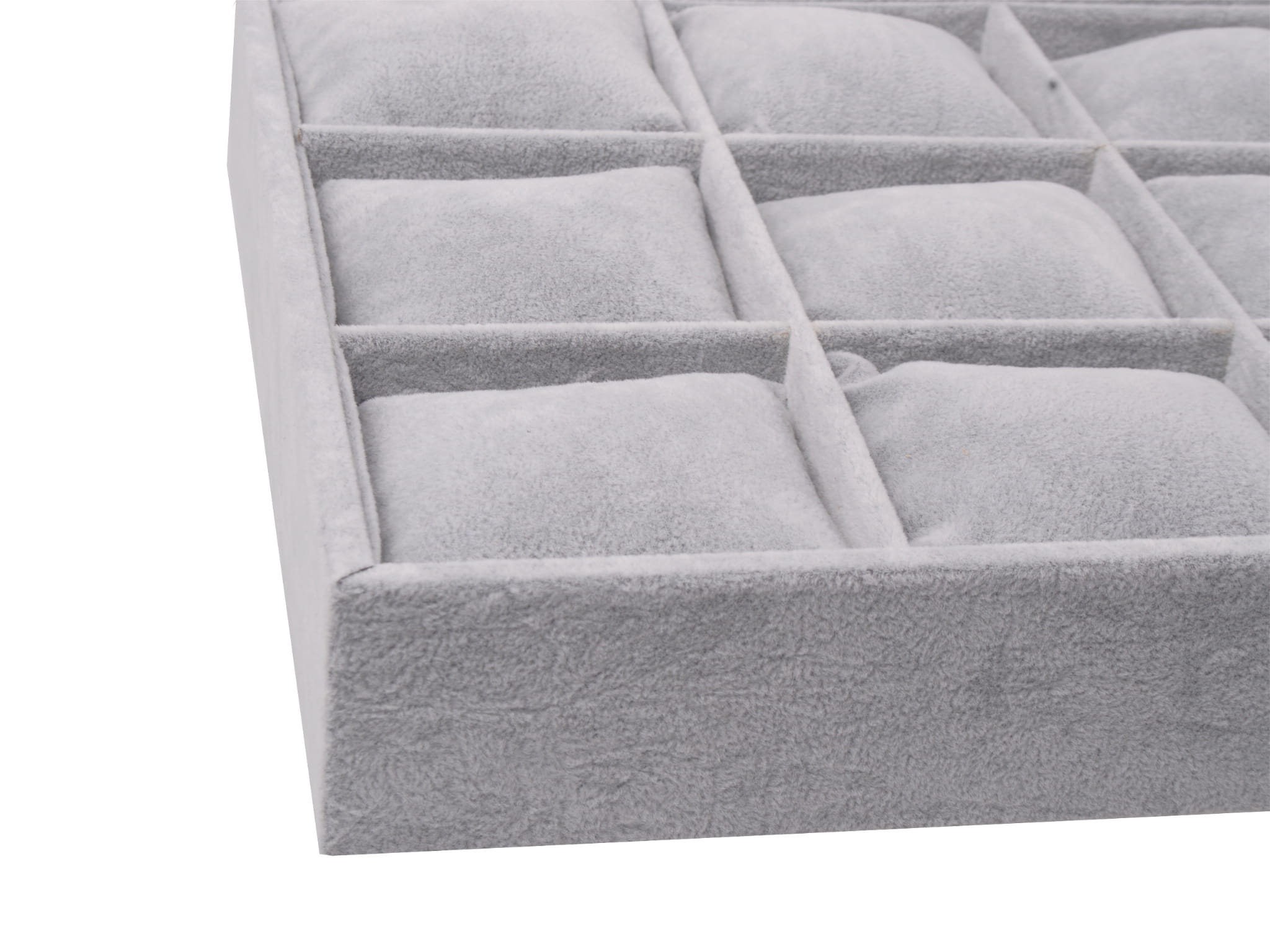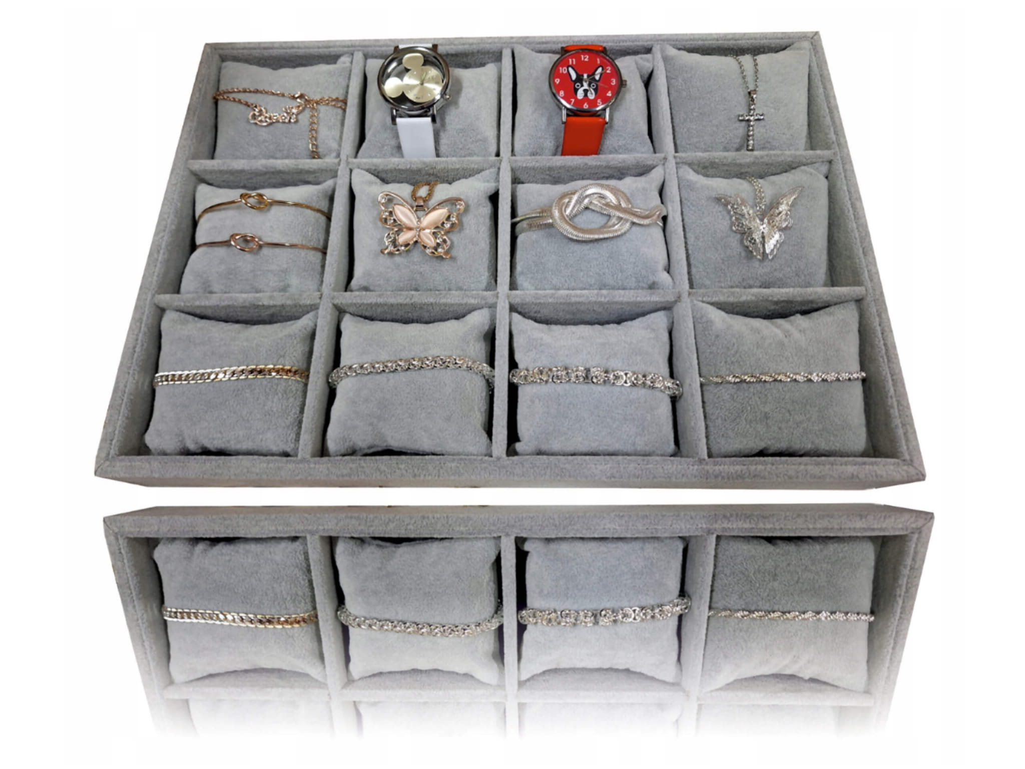 Ekspozytor na zegarki i bransoletki – szara tacka z 12 przegrodami i poduszkami