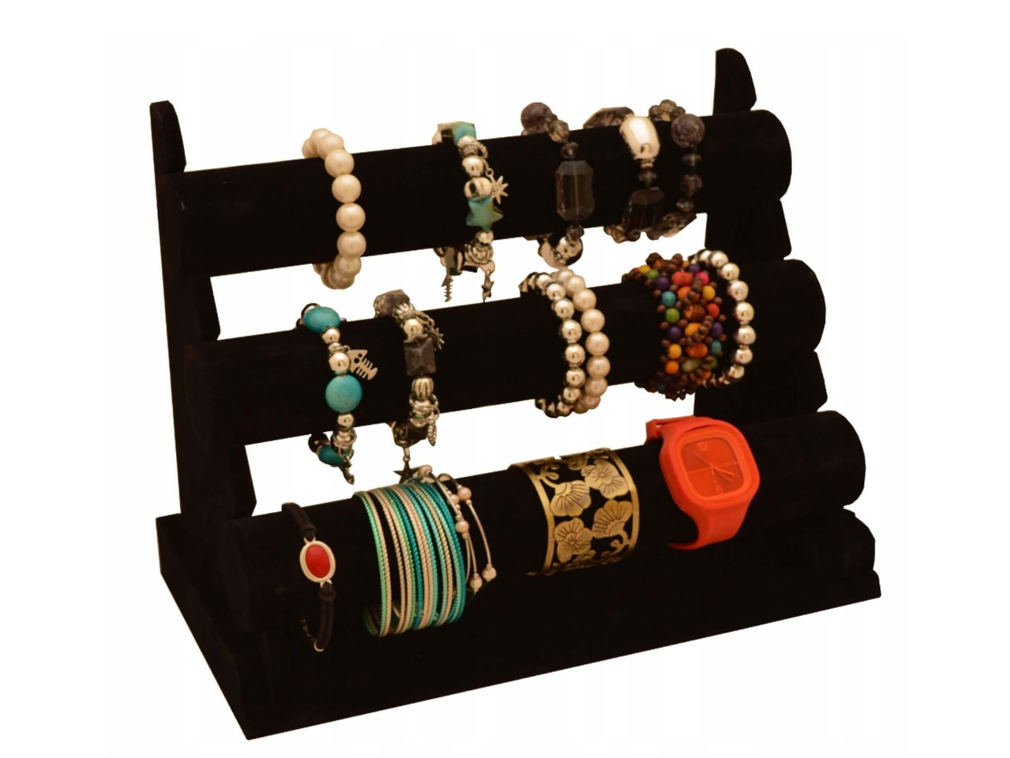 Ekspozytor na biżuterie, zegarki, łańcuszki, bransoletki - pięć wałków. Wykonany z tworzywa sztucznego pokrytego welurem w kolorze czarnym. Ekspozytor pozwala na elegancką i efektowną ekspozycje towaru...