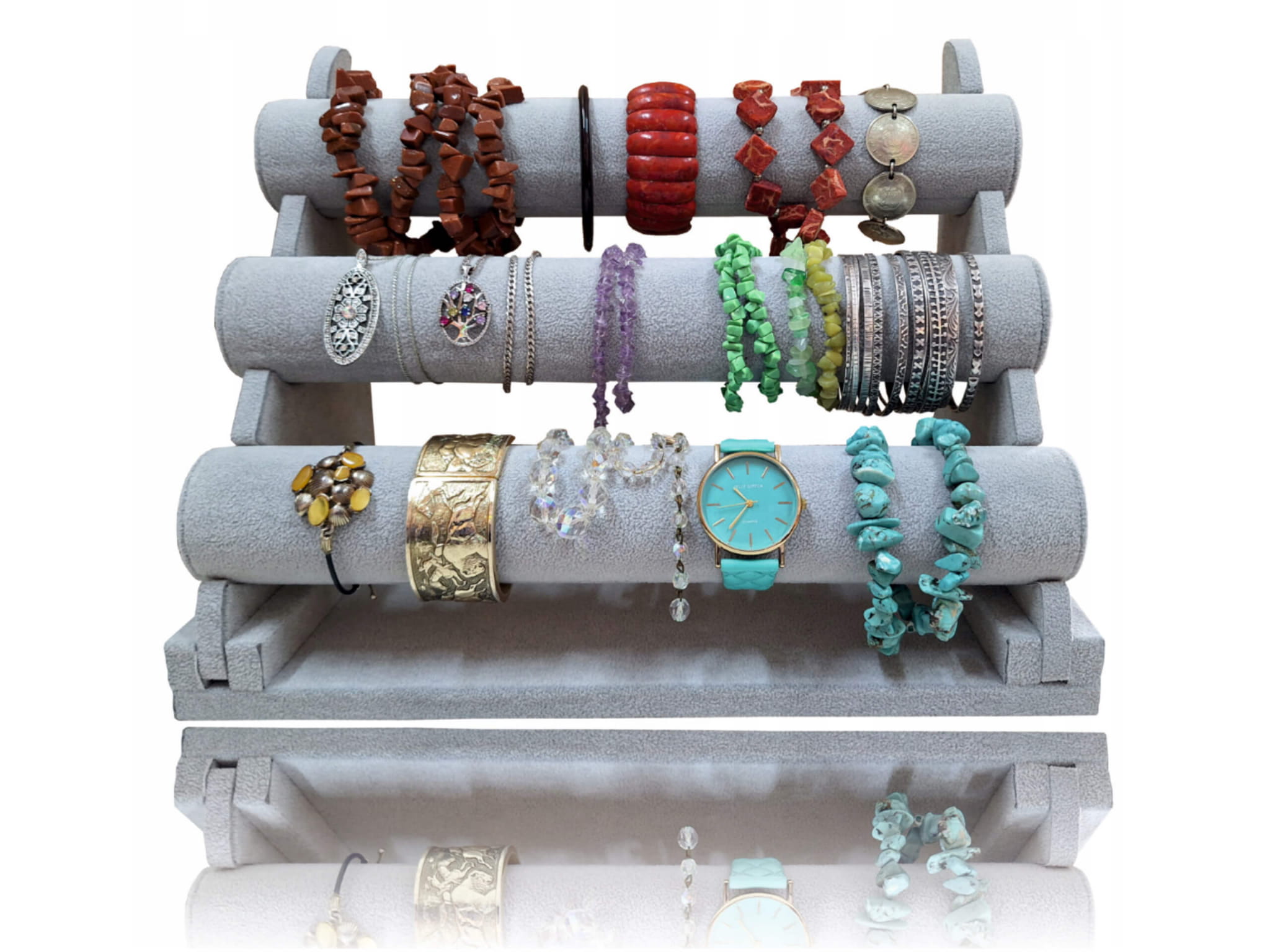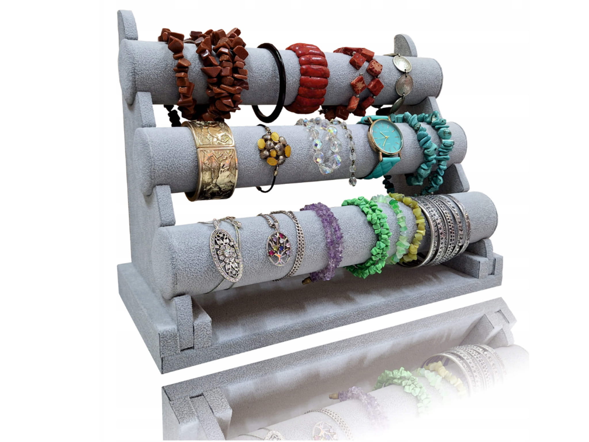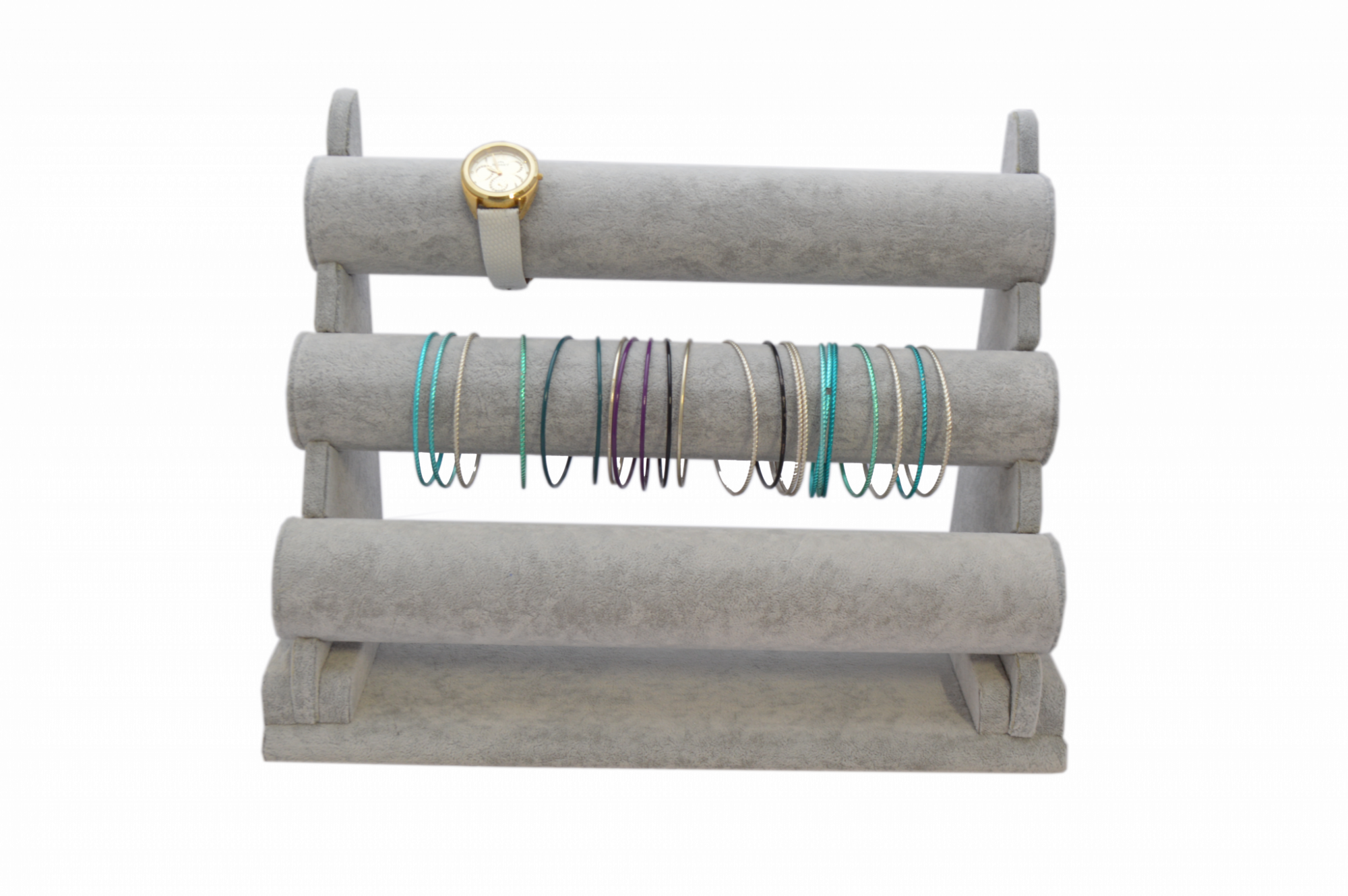 Estetyczny potrójny ekspozytor na biżuterię, wykończony materiałem zamszem w kolorze szarym. Idealny do prezentacji i przechowywania bransoletek, zegarków, łańcuszków oraz innych ozdób. Dzięki eleganckiemu designowi biżuteria na nim prezentuje się wyjątkowo stylowo, dodając wnętrzom klasy...