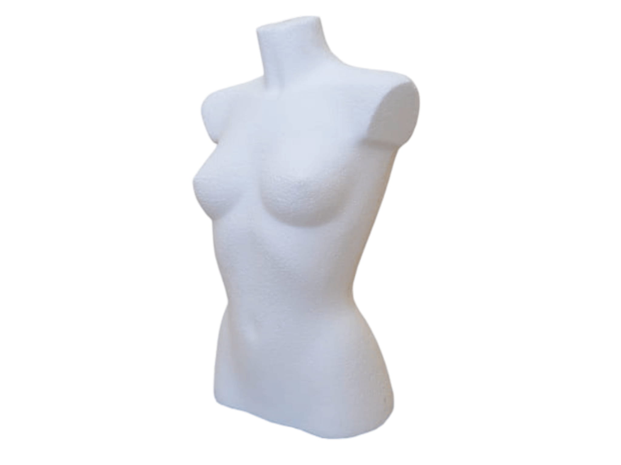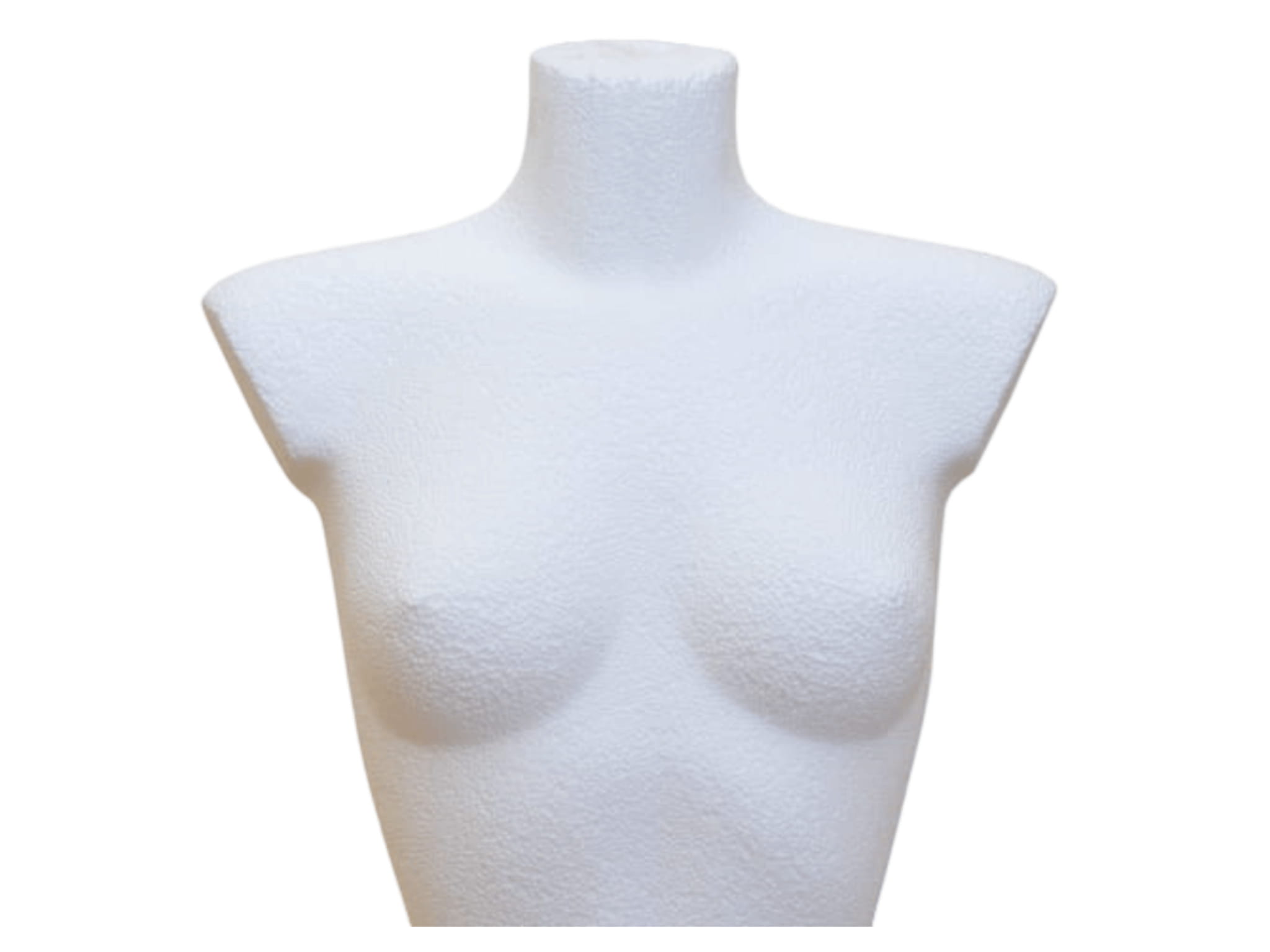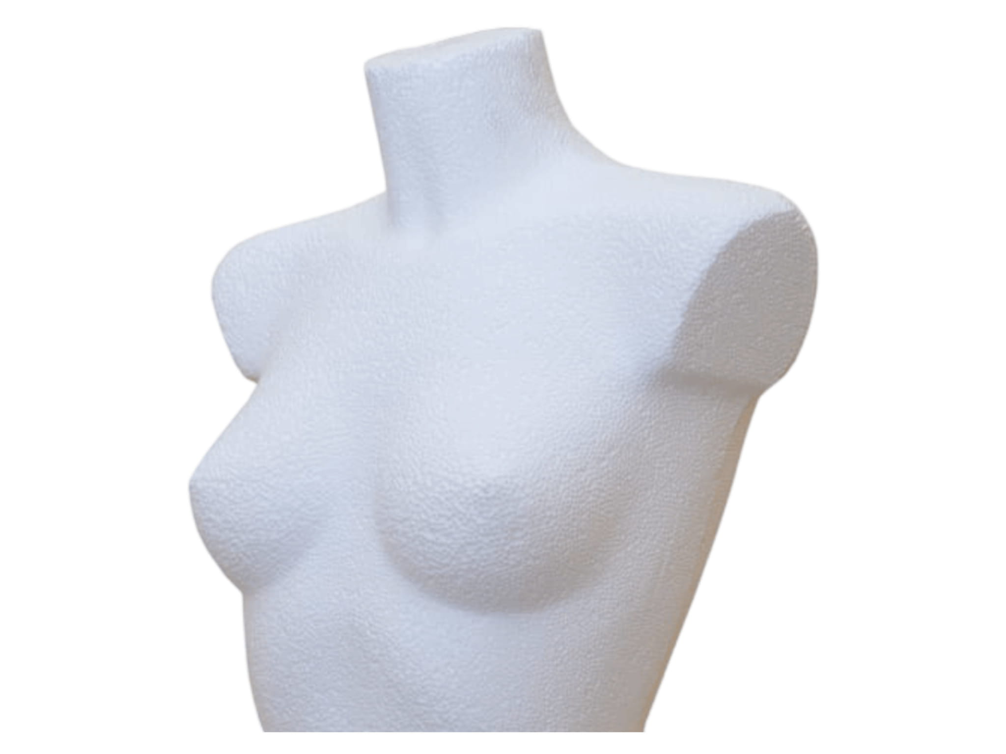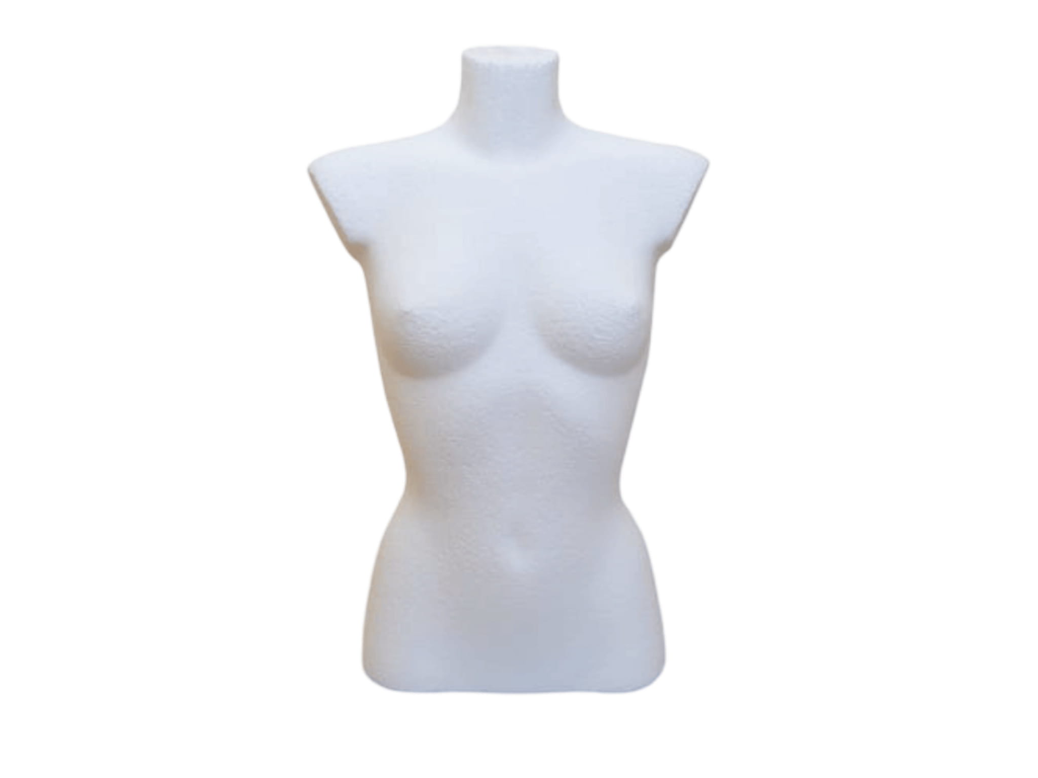 Lekki i praktyczny tors manekina wykonany z białego styropianu. Idealny do prezentacji odzieży damskiej, w tym bluzek, swetrów czy bielizny – zarówno w sklepie, jak i w pracowni krawieckiej.