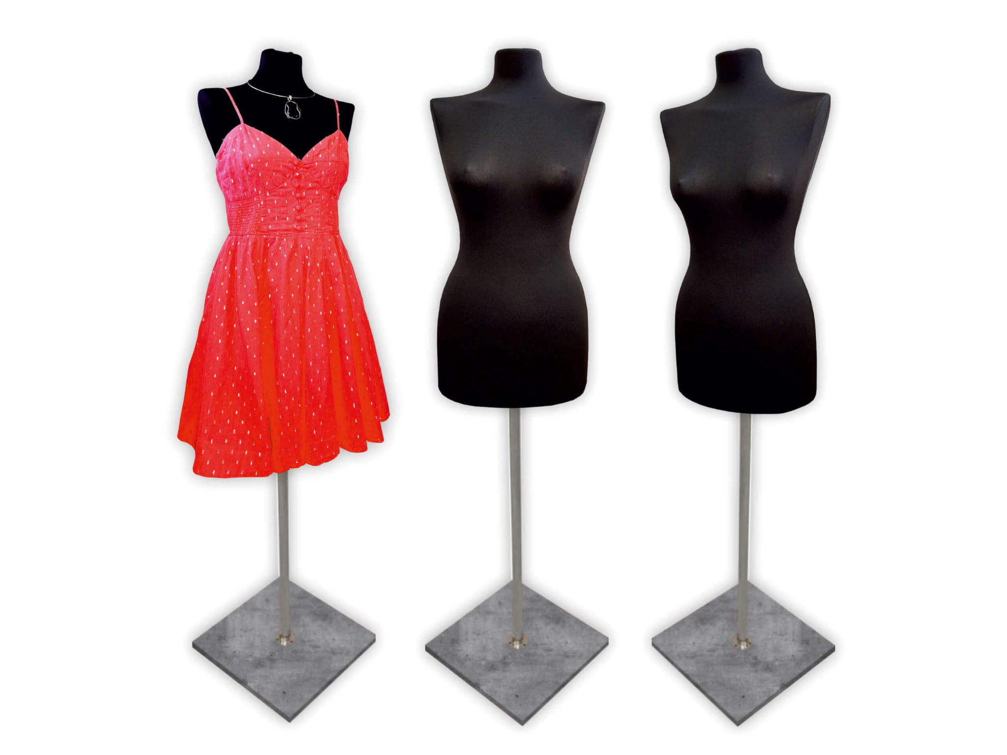 Wysoka jakość — Korpus wykonany z wytrzymałego, a zarazem lekkiego styropianu umożliwia przypinanie odzieży szpilkami, co zwiększa funkcjonalność manekina w codziennej pracy. Chromowana noga i trwała podstawa z płyty meblowej, zapewniają stabilność i estetyczny wygląd. Elastyczne koszulki można łatwo zdejmować i prać, co pozwala utrzymać manekin w czystości nawet przy intensywnym użytkowaniu. Dzięki różnorodności dostępnych kolorów podstawy i koszulek model łatwo dopasować do wystroju każdego wnętrza.