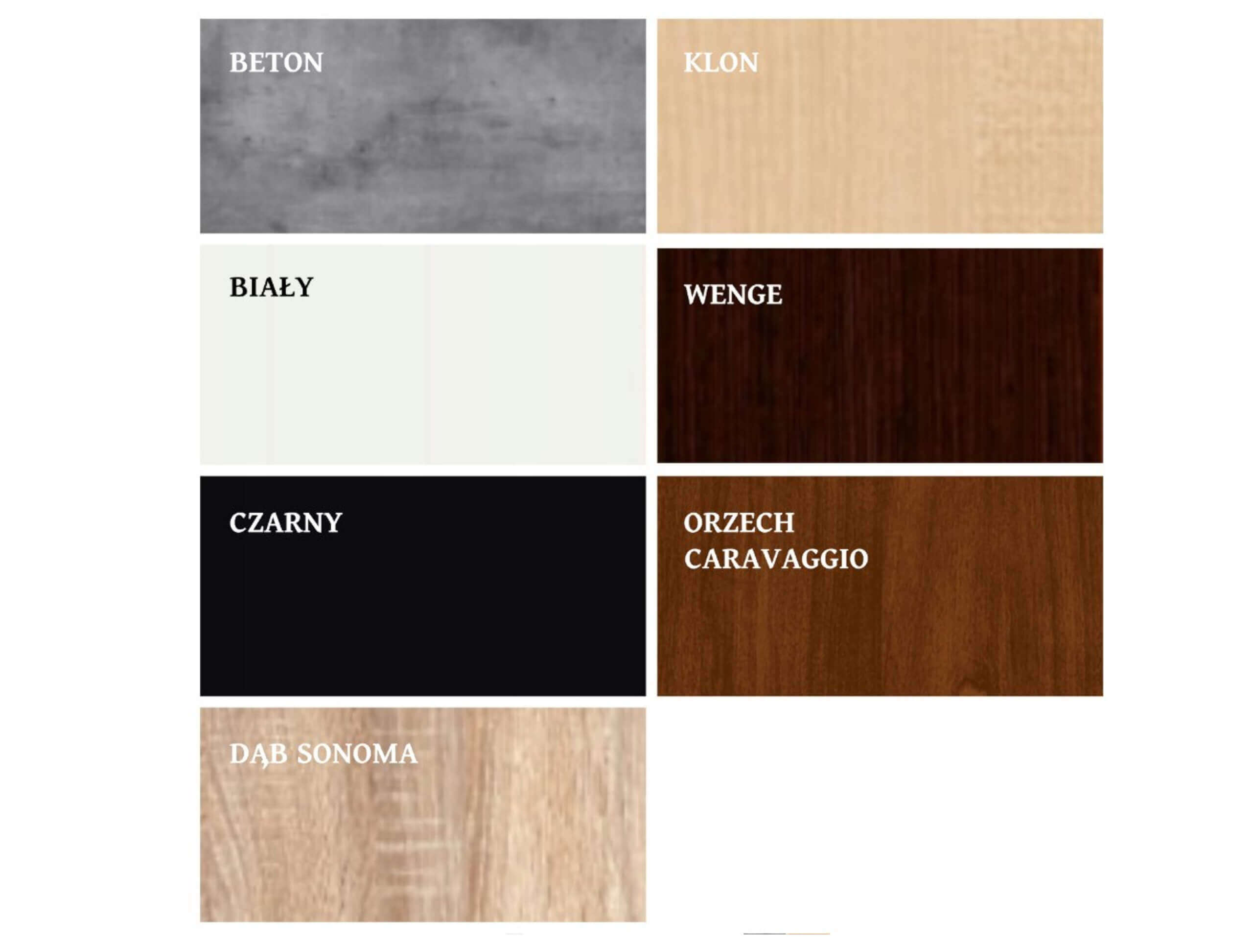 - Dostępne kolory podstawy: biały, czarny, klon, dąb sonoma, mahoń, czereśnia, wenge