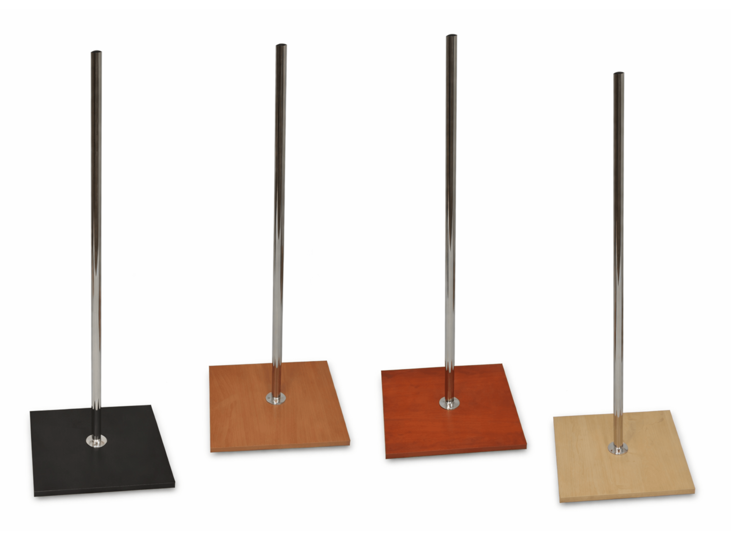 Stabilna noga do manekina wykonana z chromowanej rury o średnicy 25 mm, osadzona na solidnej płycie meblowej o wymiarach 25x25 cm.