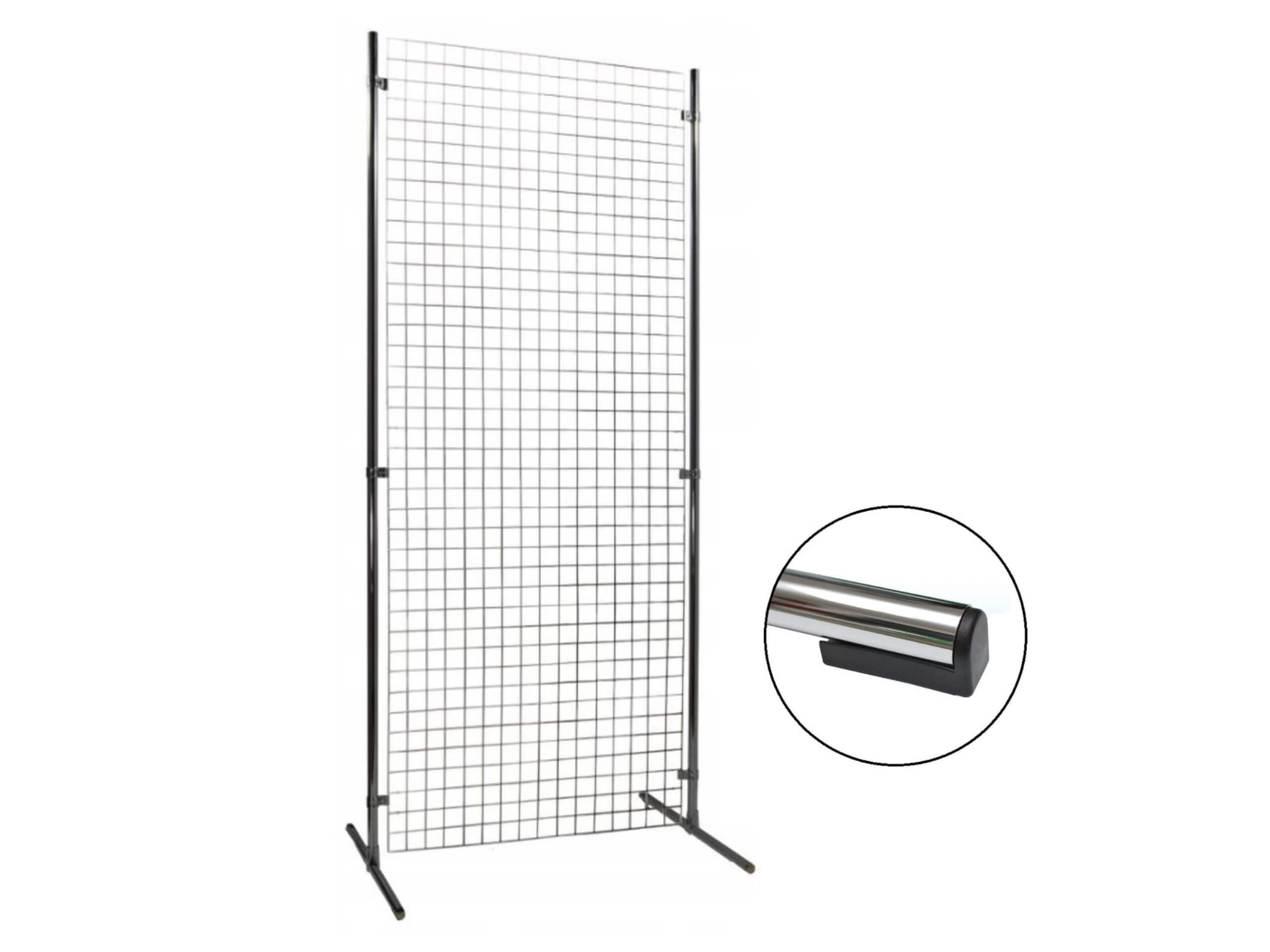 Parawan ekspozycyjny z czarnej kraty na stelażu z rury fi25 mm, doskonały do prezentacji towaru w sklepie. Gruby drut i regulowana wysokość zapewniają stabilność i wszechstronność ustawienia...