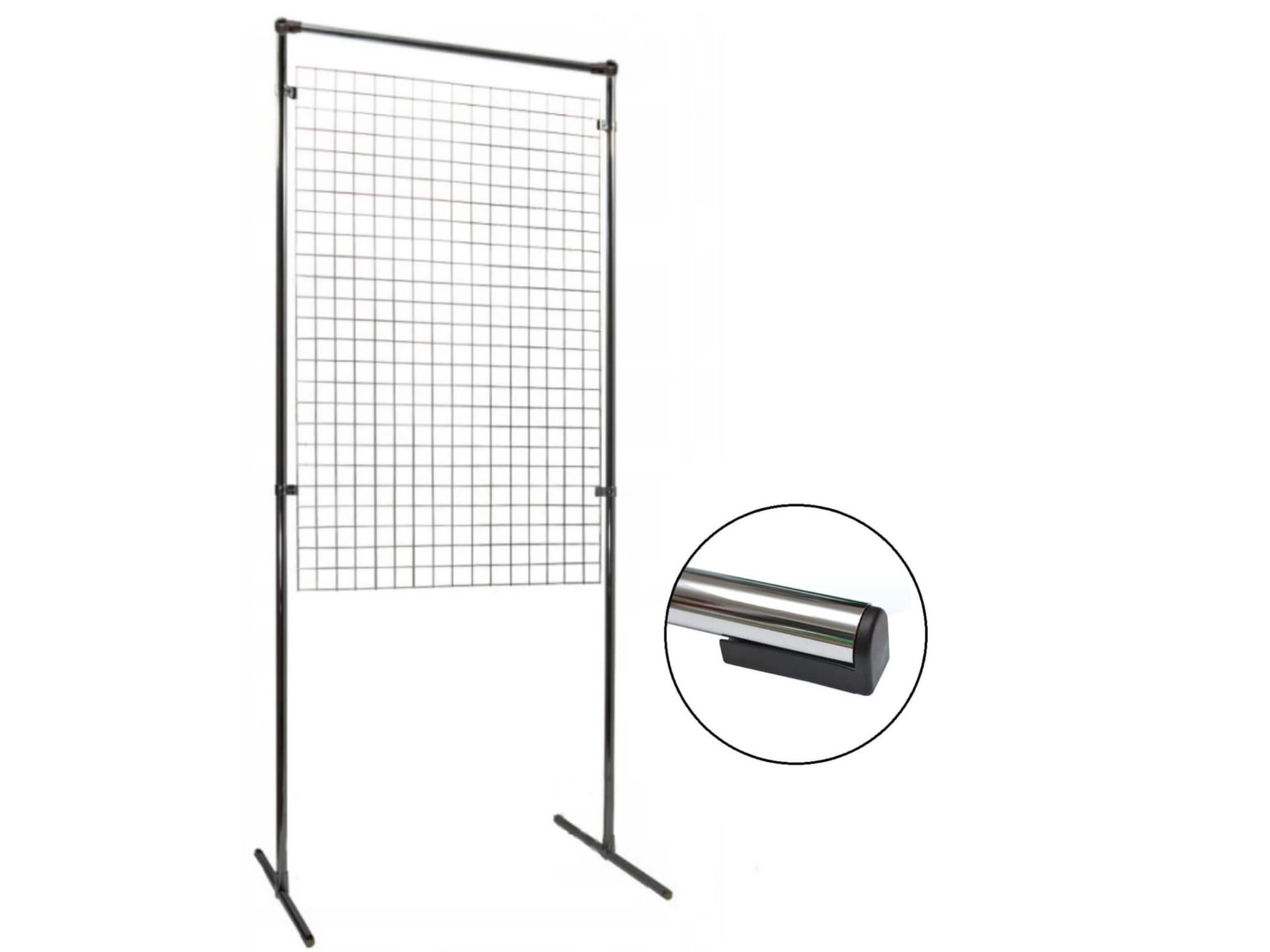 Parawan ekspozycyjny z czarnej kraty na stelażu z rury fi25 mm, doskonały do prezentacji towaru w sklepie. Gruby drut i regulowana wysokość zapewniają stabilność i wszechstronność ustawienia...