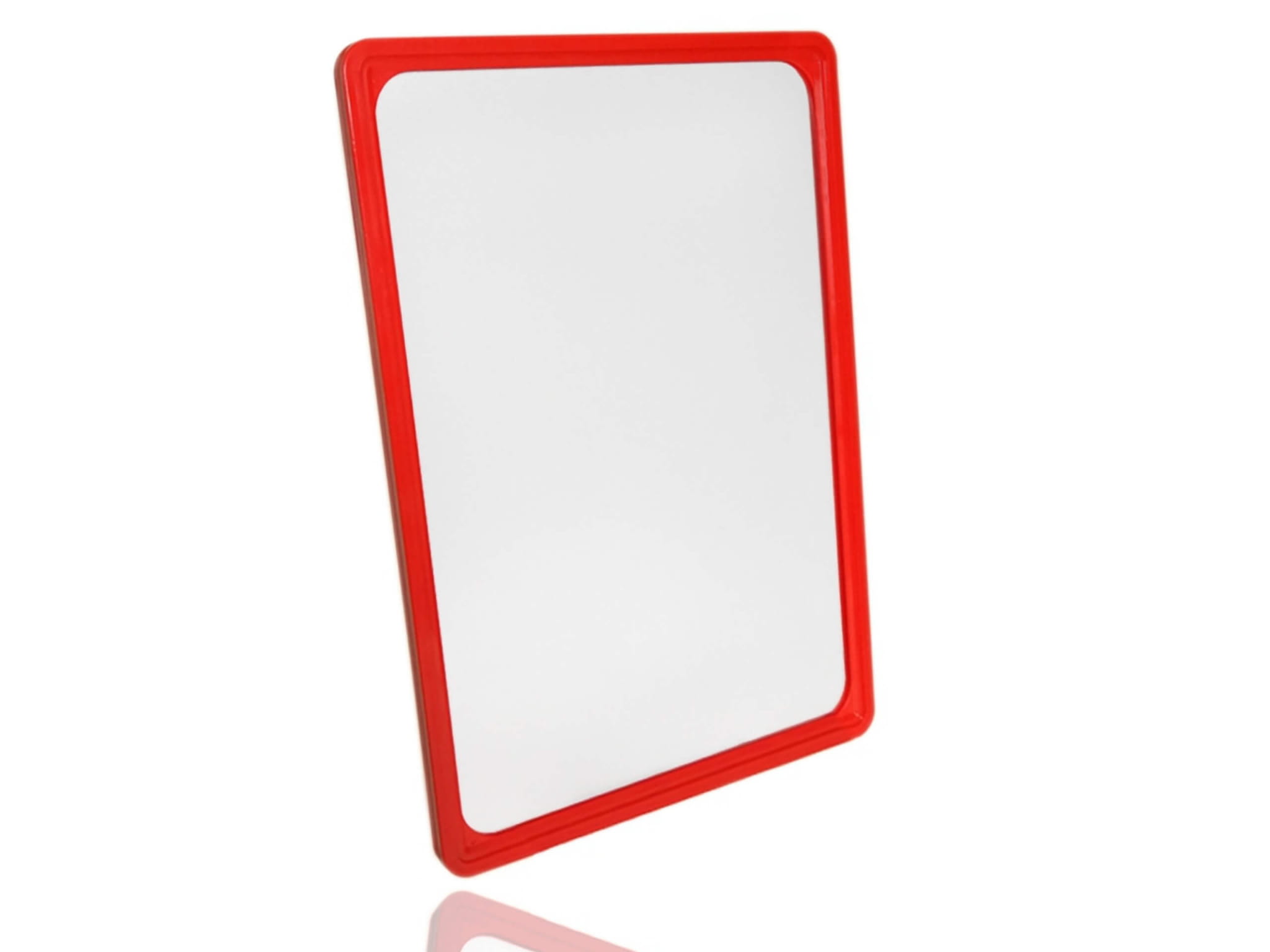 Ramka plakatowa A5 w kolorze czerwonym (RAL 3000) wykonana z trwałego materiału ABS, wyposażona w folię antyrefleksyjną. Idealna do prezentacji promocji i informacji w sklepie.