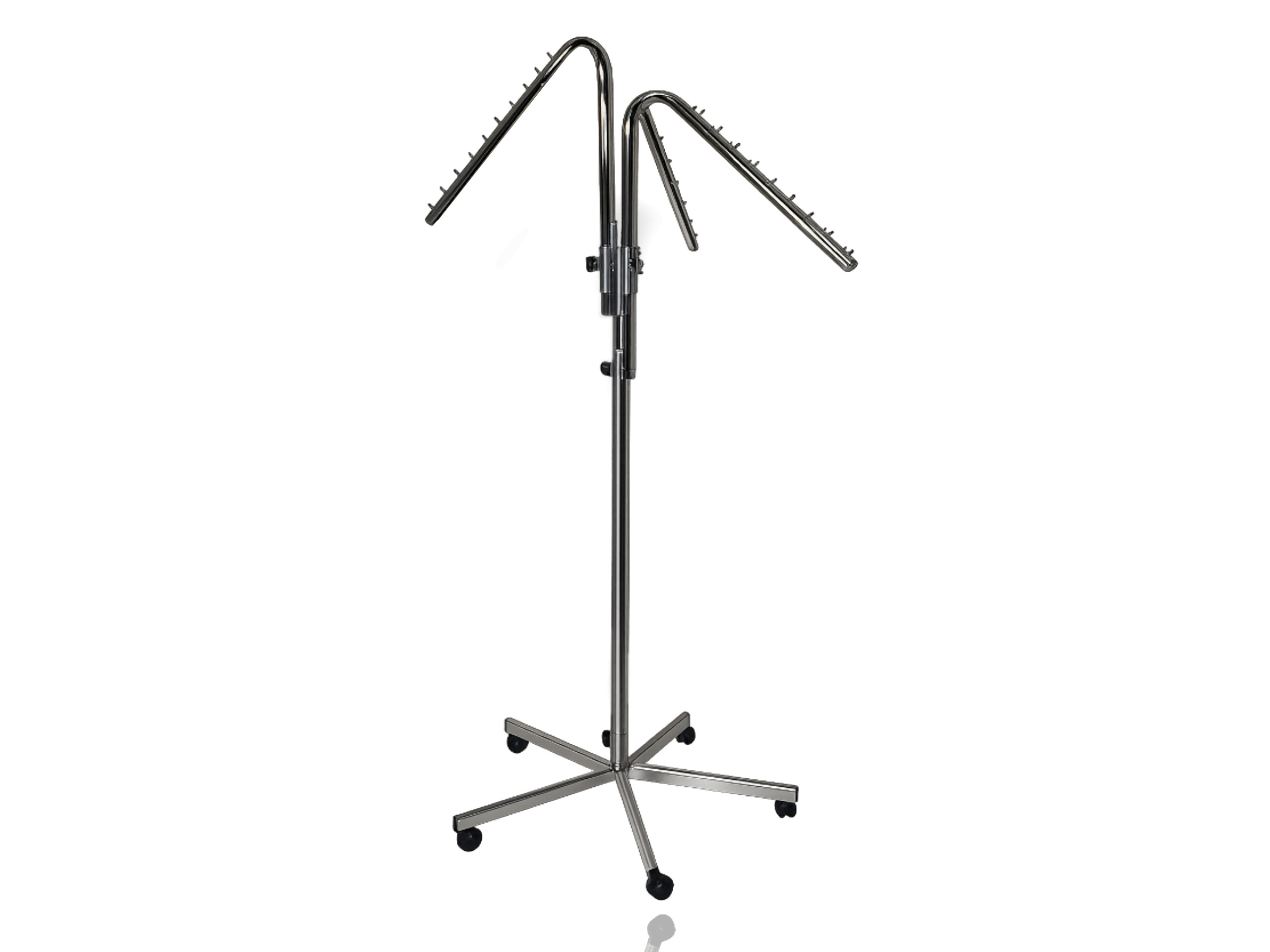 Stojak na odzież dwustronny: - regulowane wysokości, -kółka o gwincie M-8mm. Wymiary: Szerokość: 120 cm + 4 wysuwane ramiona, każde o dł. 45cm. Głębokość: 50 cm. Wysokość: od 122 do 210 cm. Kolor: dolna część stojaka malowana proszkowo na kolor czarny, górna pokryta chromem galwanicznym.