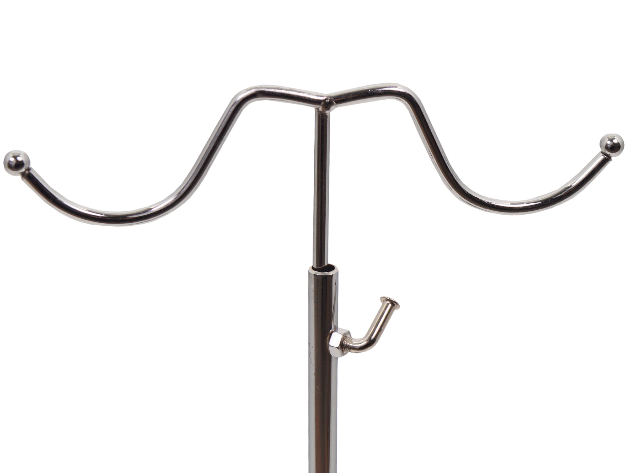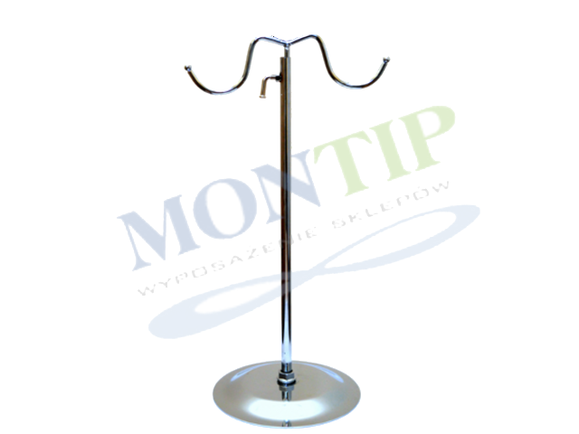 Regulowany stojak na torebki przeznaczony do ekspozycji dwóch torebek jednocześnie. Dzięki możliwości regulacji wysokości pozwala na zawieszenie zarówno torebek z krótkim uchwytem, jak i tych z długim paskiem. Noga oraz podstawa stojaka są chromowane, co zapewnia mu estetyczny i elegancki wygląd.