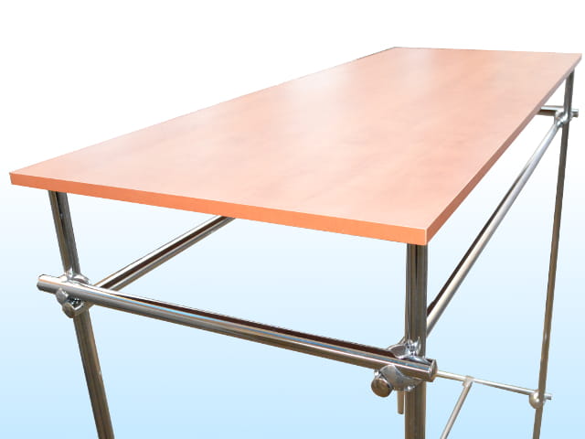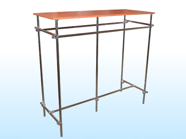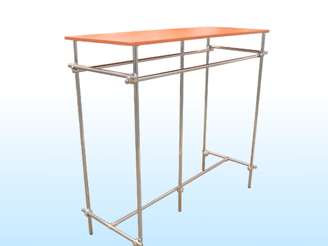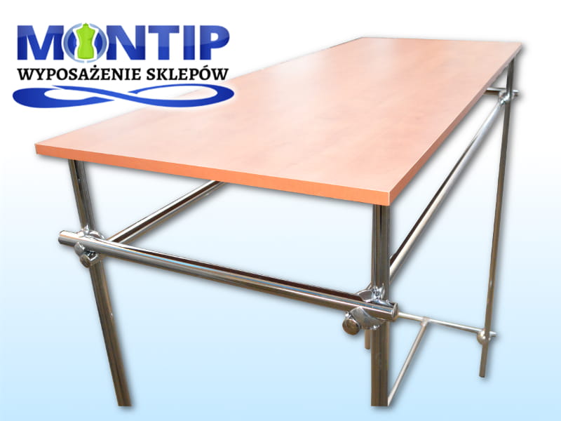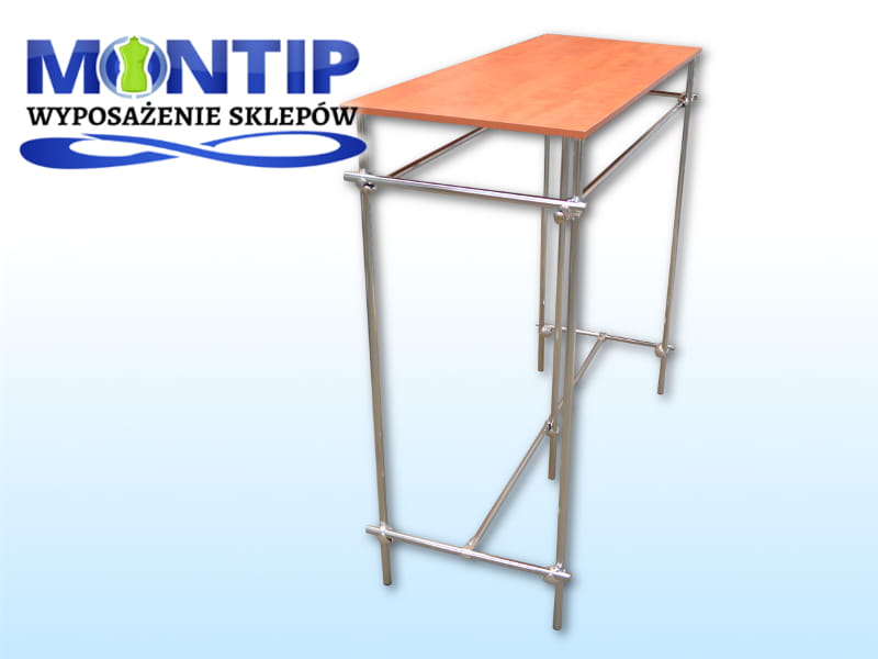 Stojak na ubrania do sklepu z półką wyspa gondola, wykonany z rury chromowanej fi 25. Stojak ze względu na swą prostotę i funkcjonalność idealnie nadaje się ekspozycji odzieży w sklepie. Wyposażony w dodatkową półkę z płyny laminowanej o grubości 18 mm w kolorze calvados.