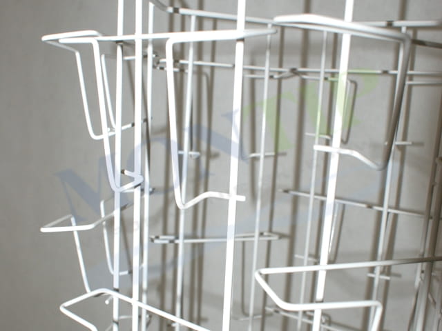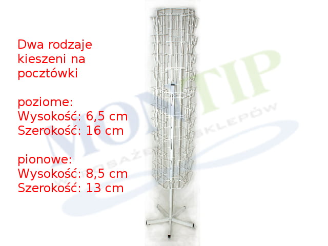 Stojak obrotowy idealny do eksponowania kartek pocztowych, widokówek, mapek turystycznych i ulotek. Wykonany z mocnego drutu malowanego na biało, zapewnia wygodny dostęp do towaru dzięki obrotowej konstrukcji. Doskonały do sklepów w kurortach letniskowych i miasteczkach turystycznych.