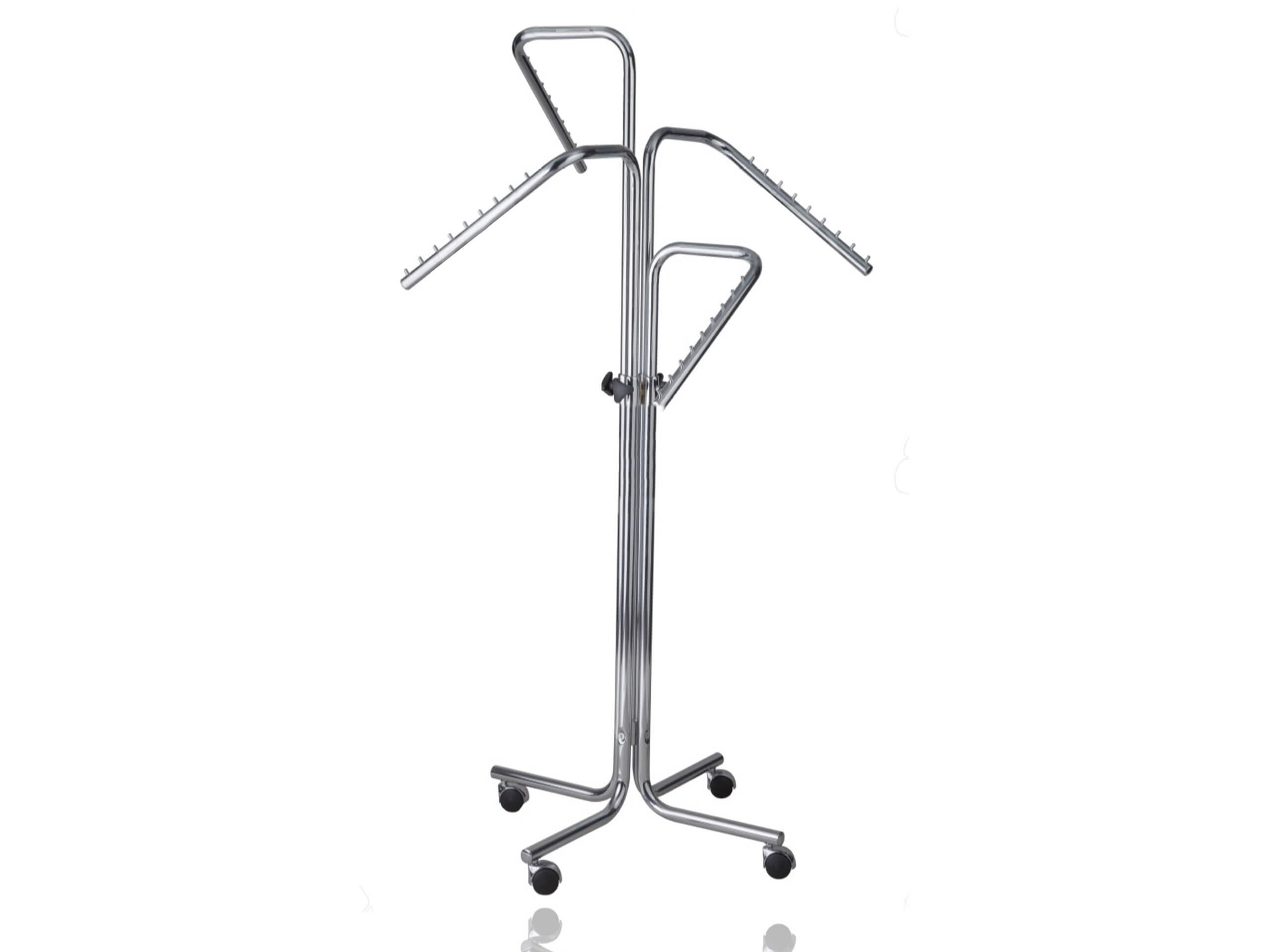 Stojak na odzież na kółkach: - regulowany, wysokość całkowita oraz regulacja wysokości każdego z ramion - w każdym z ramion po 9 bolców do zawieszania - 4 ramiona skośne-łamane na jednej rurze Wymiar: Wysokość regulowana: od 110 cm do 185 cm Długość ramion 40 cm