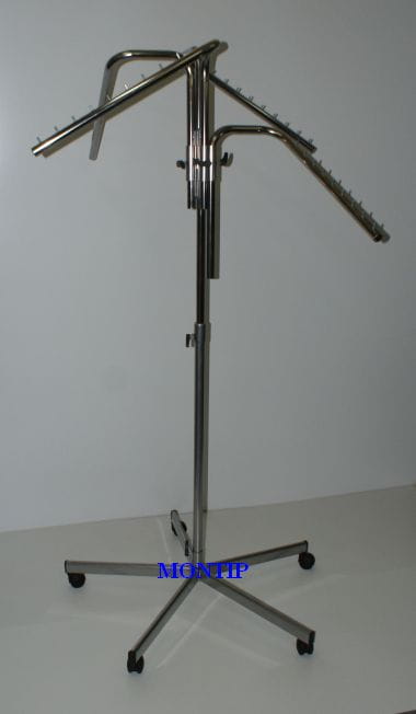 Stojak na odzież malowany na kółkach: - regulowany 2 punktowo: wysokość całkowita oraz regulacja każdego z ramion, - 3 ramiona skośne na 1 rurze - w każdym z ramion po 9 bolców do zawieszania Wymiar: Wysokość: od 140 cm do 180 cm Kolor: malowany na kolor srebrny (ramiona stojaka są chromowane galwanicznie)