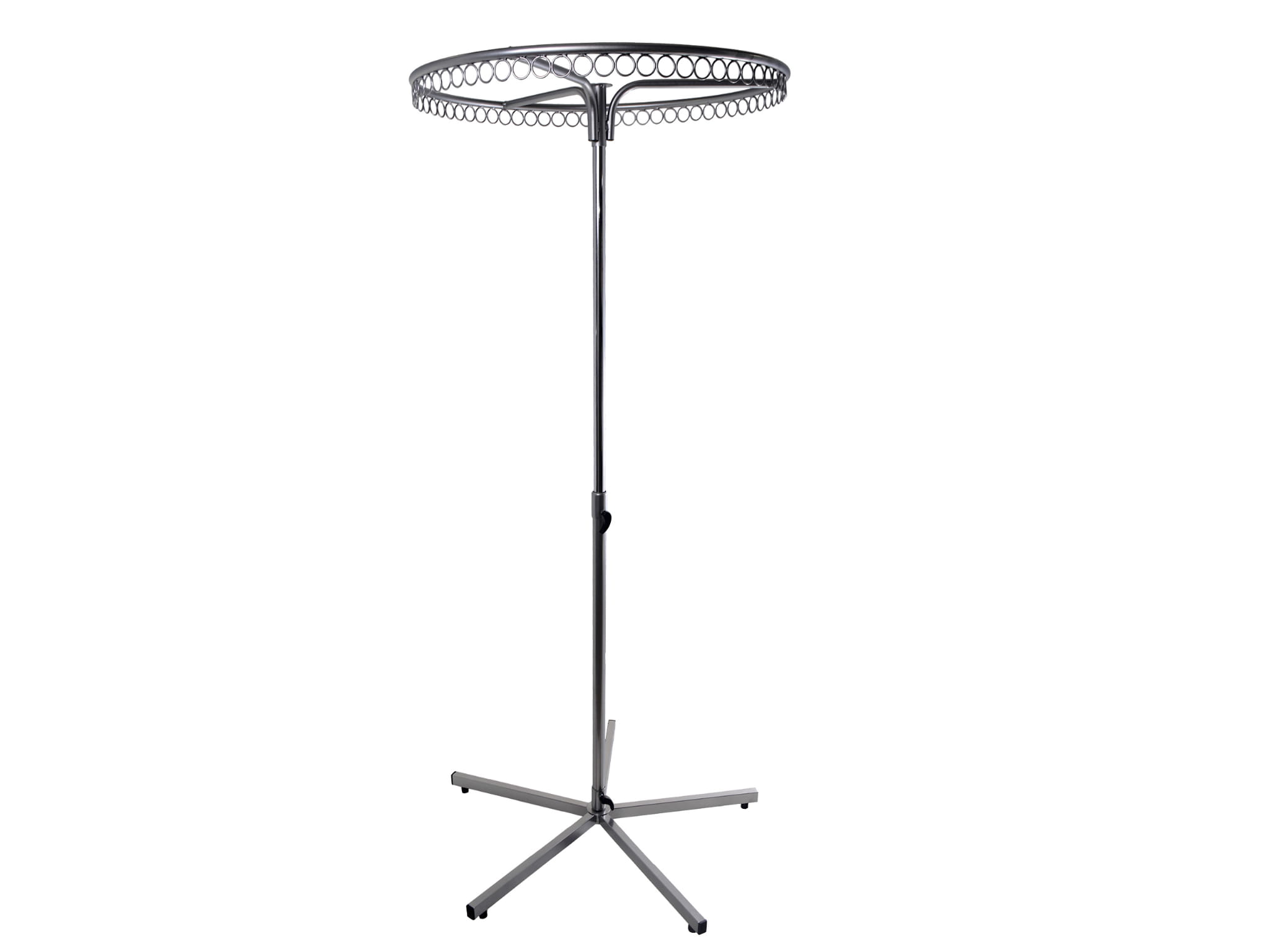 Stojak przeznaczony do wieszania odzieży. Wymiary: Wysokość maksymalna: 140 (dół) 180 cm (góra) Wysokość minimalna: 110 cm Szerokość: 130 cm 32 oczka do zawieszania odzieży. Stojak jest regulowany. Kolor: malowany na kolor srebrny