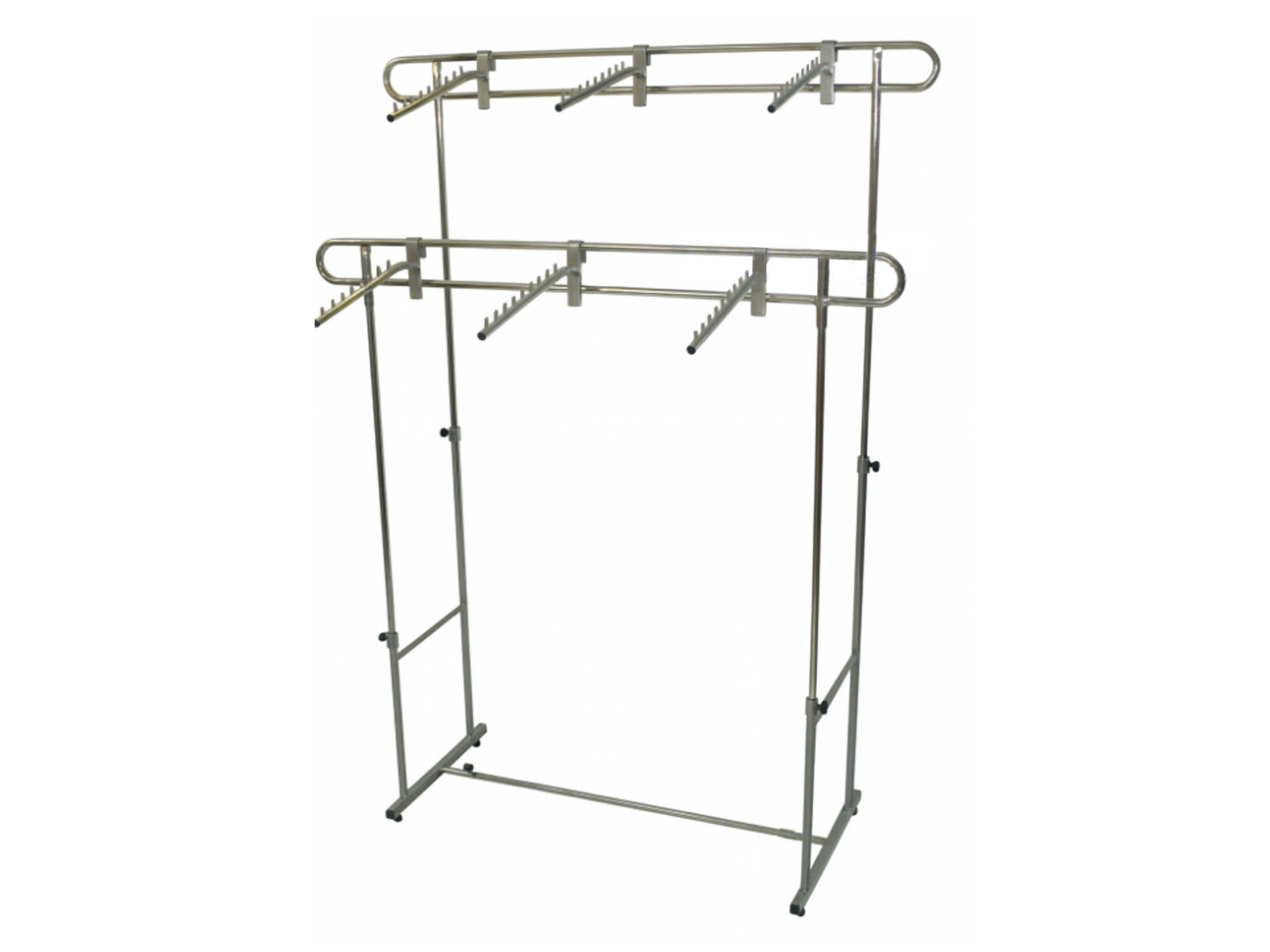 Stojak na odzież podwójne poprzeczki: - regulowana wysokość - kółka o gwincie: M-8mm. Wymiary: Szerokość: 120 cm + 4 wysuwane ramiona, każde dł. 45cm. Głębokość: 50 cm Wysokość: od 112cm do 185cm. Kolor: dolna część stojaka malowana proszkowo na kolor czarny, górna pokryta chromem galwanicznym.