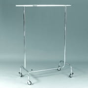 Stojak na odzież pojedynczy chromowany: - brak regulacji wysokości - wysuwane wysięgniki - kółka o średnicy 80mm Wymiary: Szerokość: 140 cm + długość wysięgnika 2x30 cm Głębokość: 55 cm Wysokość: 150 cm Kolor : chrom Oryginalny produkt włoski.