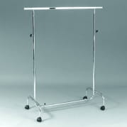 Stojak na odzież pojedyncza poprzeczka: - regulowana wysokość - kółka o gwincie M-8mm. Wymiary: Szerokość: 120 cm. + 2 wysuwane ramiona, każde o dł. 45cm. Głębokość: 50 cm Wysokość: od 112cm do 185 cm. Kolor: dolna część stojaka malowana proszkowo na kolor czarny, górna pokryta chromem galwanicznym.