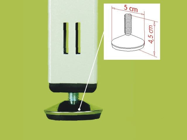 Stopka metalowa Wysokość stopki z gwintem: 35 mm Kolor: chrom Istnieje możliwość regulacji wysokości stopki. Do stopki można dokupić wkładkę plastikową z gwintem R-12P lub wkładkę metalową z gwintem R-12M