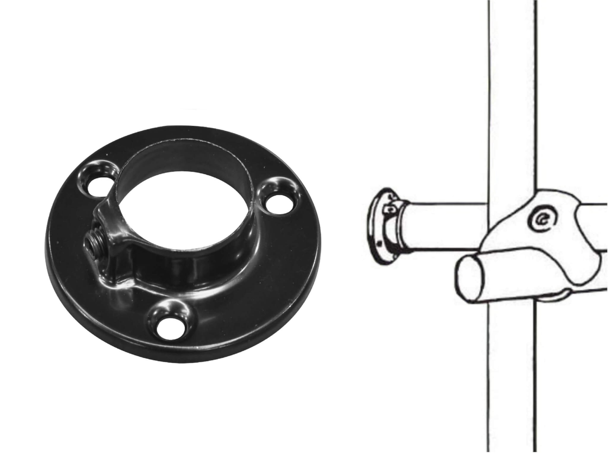 Metalowa stopka/rozetka przeznaczona do mocowania rur o średnicy 25 mm. Wykonana z tłoczonej blaszki stalowej, w kolorze czarnym, idealna do montażu w szafach, balustradach czy wieszakach.