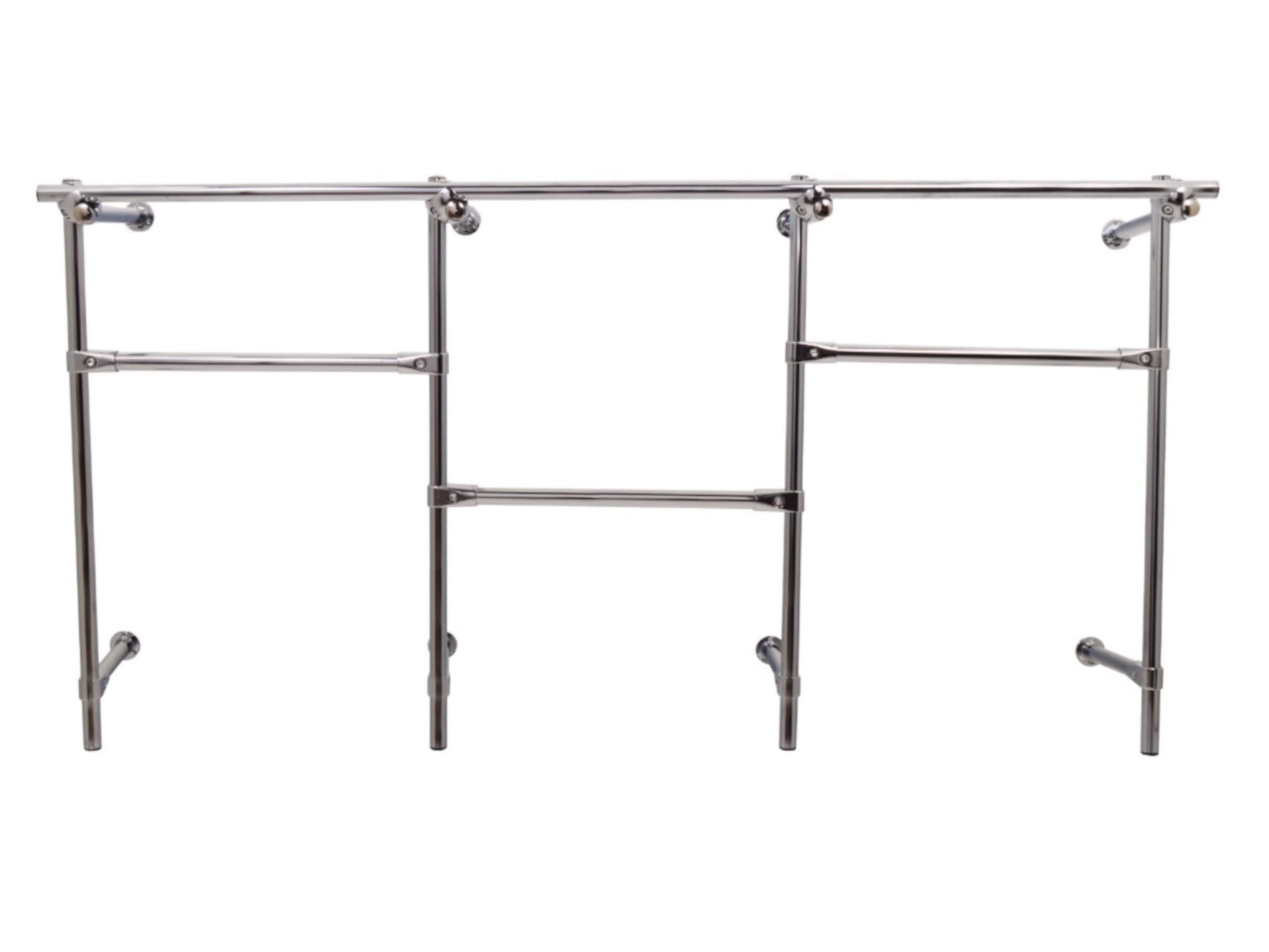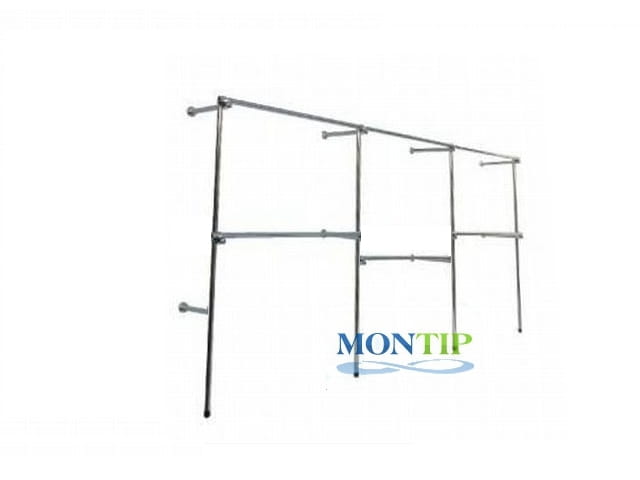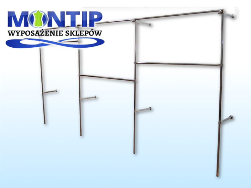 Stabilny wieszak PRZYŚCIENNY z ruchoma poprzeczką, wykonany z rury chromowanej fi 25 mm, mocowany 8-miopunktowo do ściany za pomocą odpowiednich rozetek. Poprzeczki można ustawiać na dowolnej wysokości niezależnie od siebie.