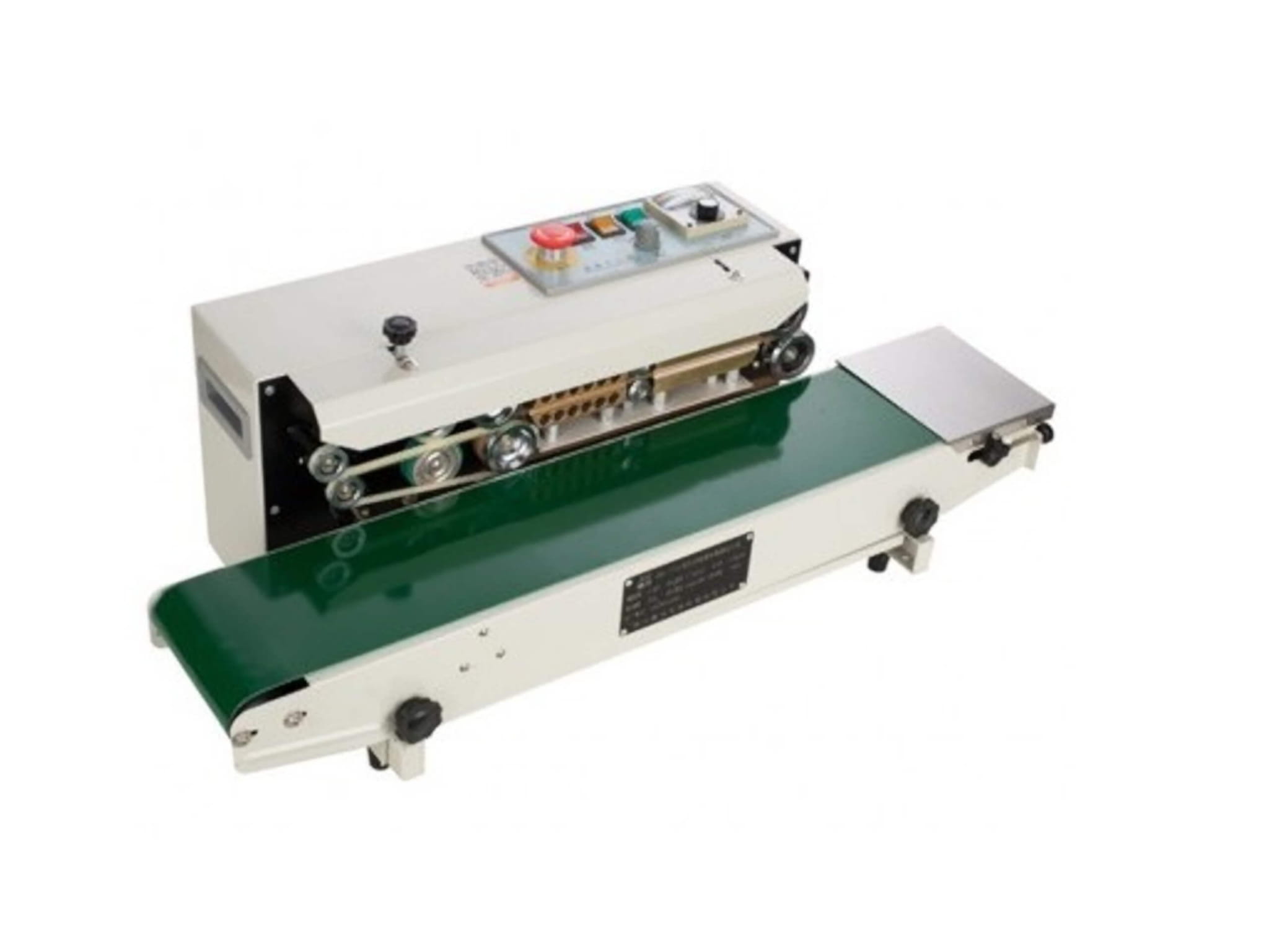 Urządzenie zgrzewające służące do zgrzewania produktów, które umieszczone są w workach na układzie transportującym na płasko. Torebki znajdujące się na pasie transportującym przesuwają się samoczynnie.