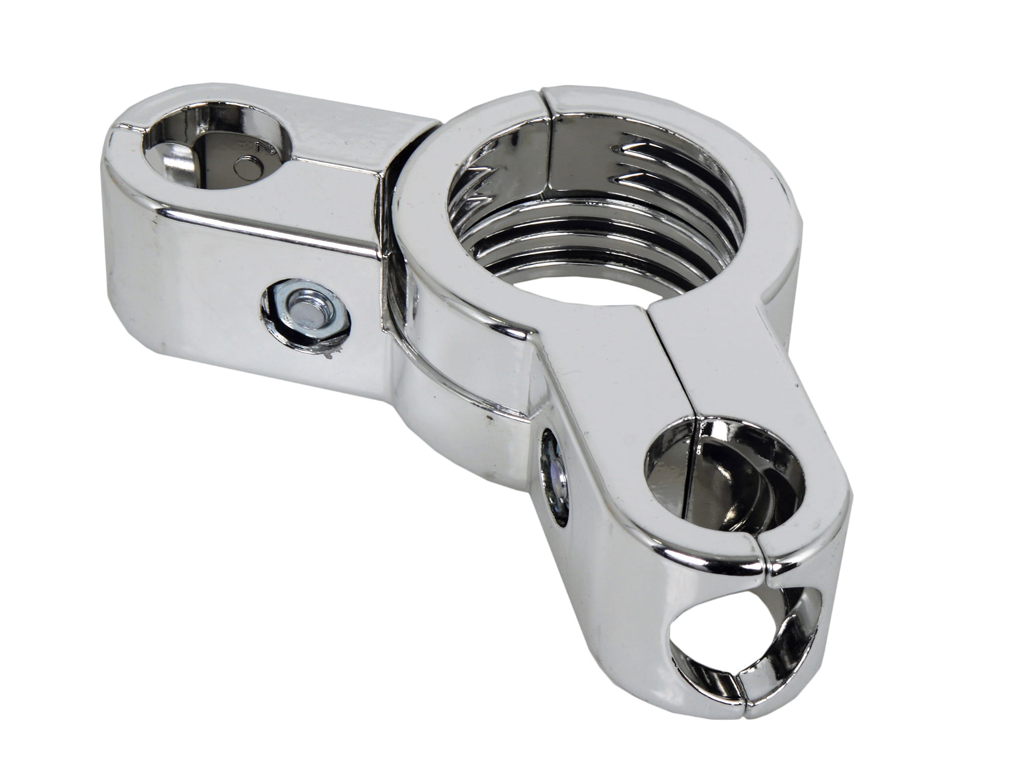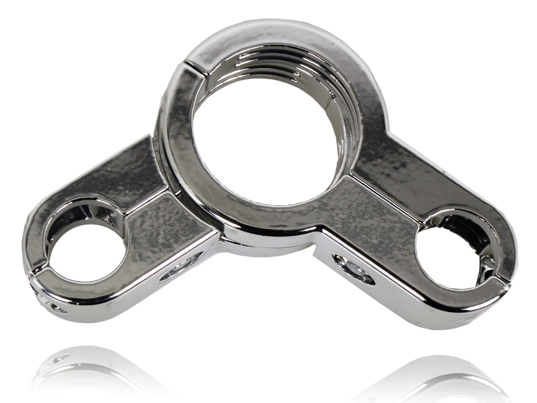 Chromowana złączka redukcyjna z aluminium, przeznaczona do łączenia rur o średnicy 50 mm z rurami fi 25 mm – równolegle lub prostopadle, z możliwością regulacji kąta rozwarcia.
